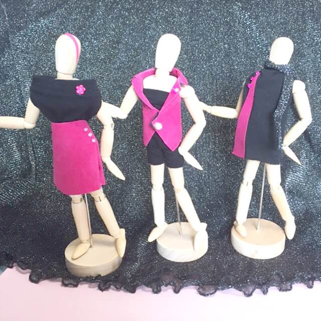 デッサン用ポーズ人形、布用ボンド、はさみ、古着端切れなどの布、フェルト、リボン、ビーズ、マスキングテープ