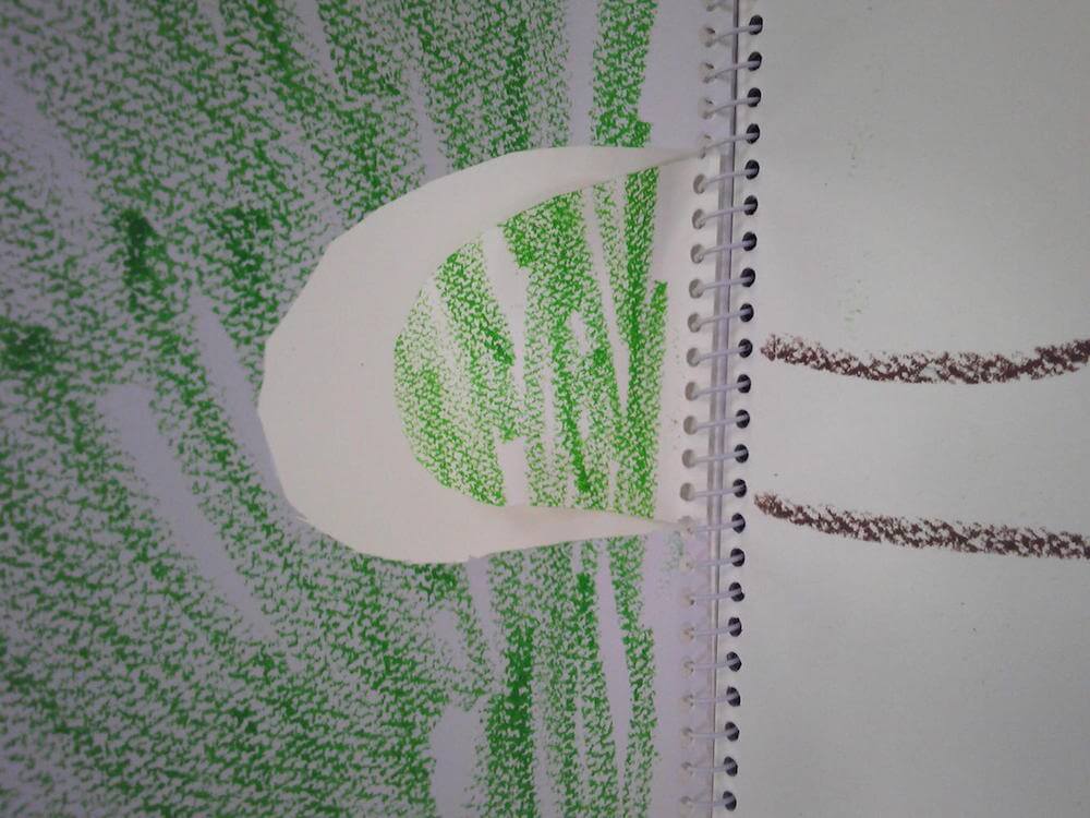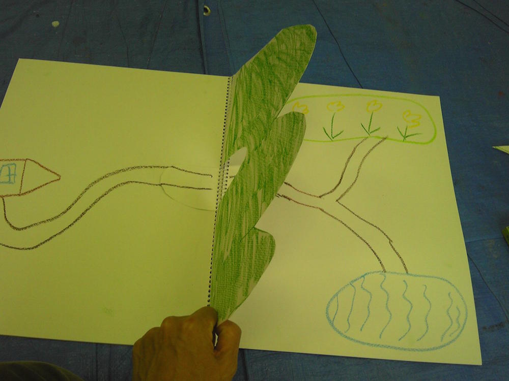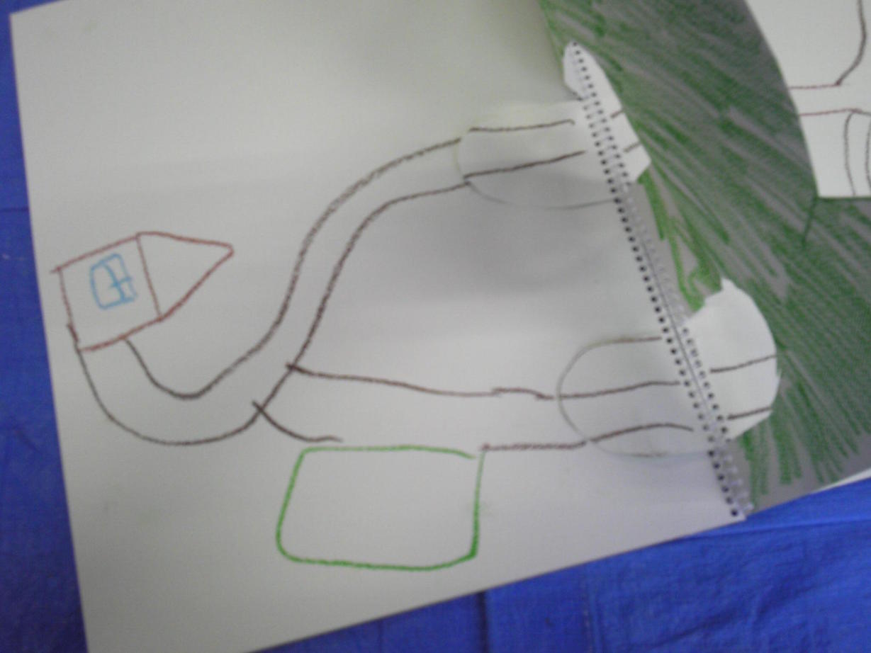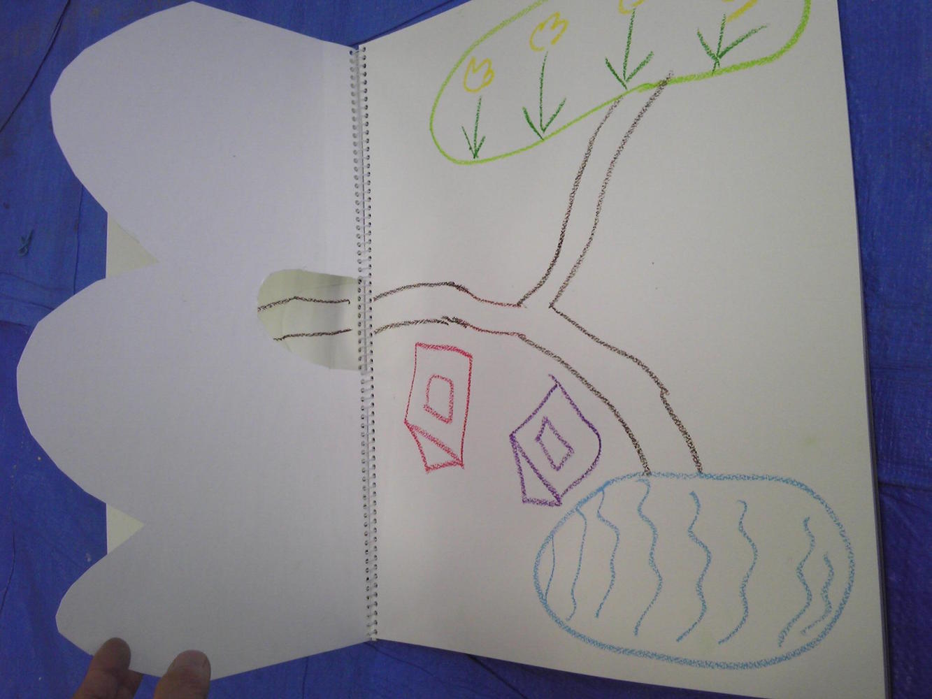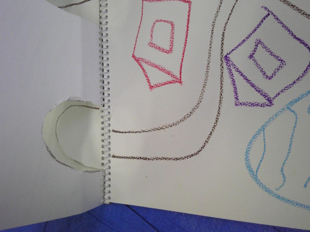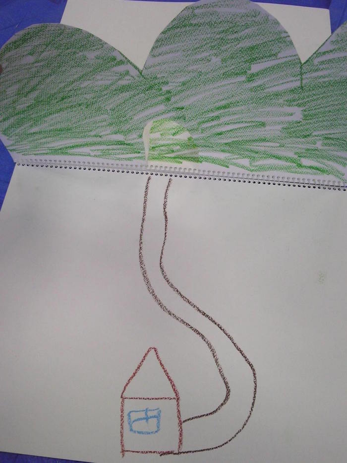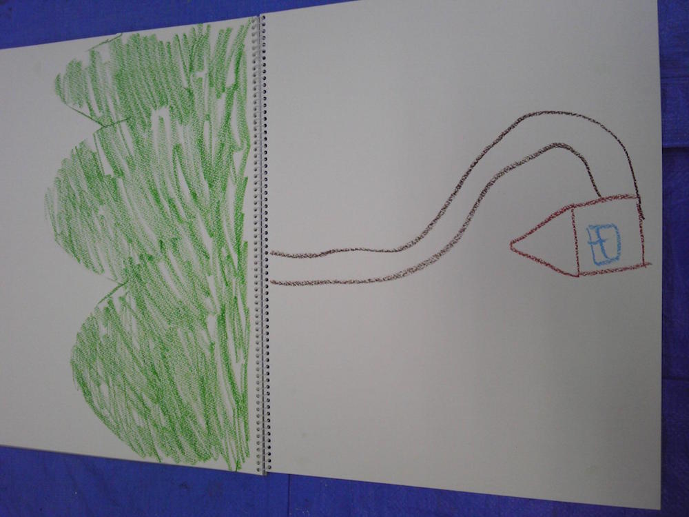 スケッチブックのページの一枚をお山や、建物などにみたてて絵を描いていく。お山の向こうには何があるんだろう? でも、これは絵だから向こう側は描けないね。 いやいや、そんなことはないよ。こうすれば・・・・・