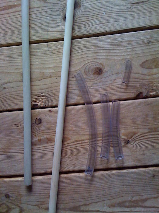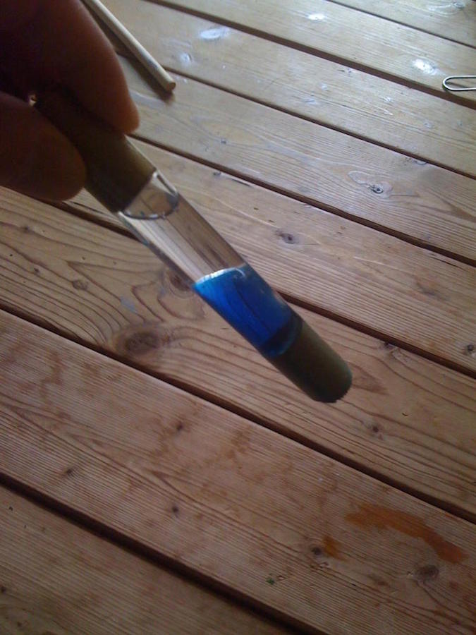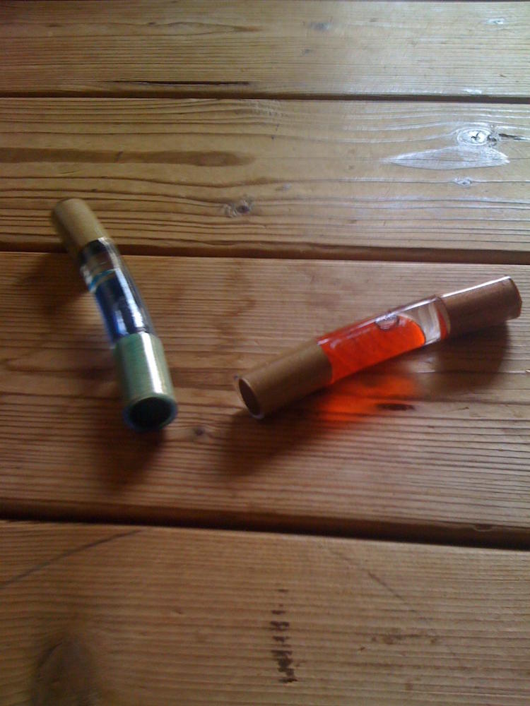 色水とベビーオイルを透明のチューブに閉じ込めます。チューブより少し太めの円柱の木材を切って蓋にすれば。漏れにくく。。お手軽で。。見た目もよいのでは?と考えました。