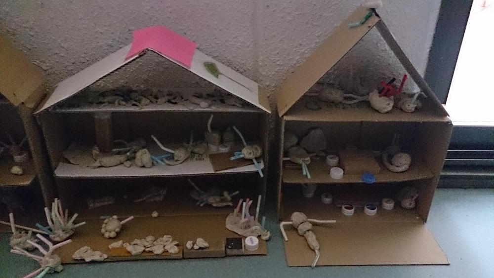 数人でグループになって、段ボールのおうちの中をねんどでつくったもので遊びます。