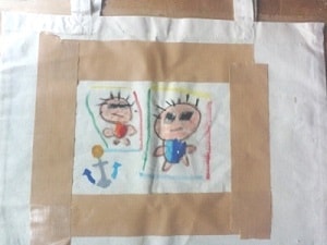 エコバックにガムテープでマスキングをし、布がきクレヨンでその中にお絵描き。