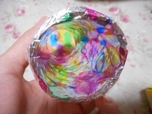 油性カラーペンで色付けしたアルミホイルをトイレットペーパーの芯の中にいれる。