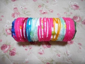 まわりにおりがみを貼ったり、毛糸を貼ったりいろいろな素材を貼り付けて完成。