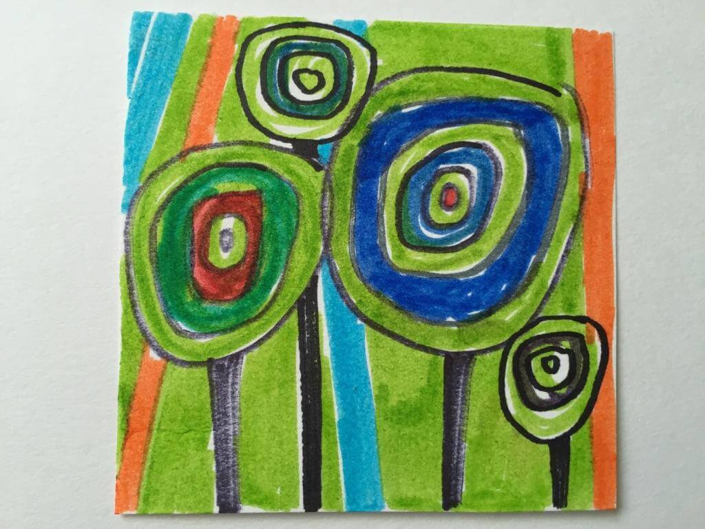 画用紙ひとり数枚、カラーペン(油性、水性) 、フンデルトヴァッサーの画集や作品画像をコピーしたもの