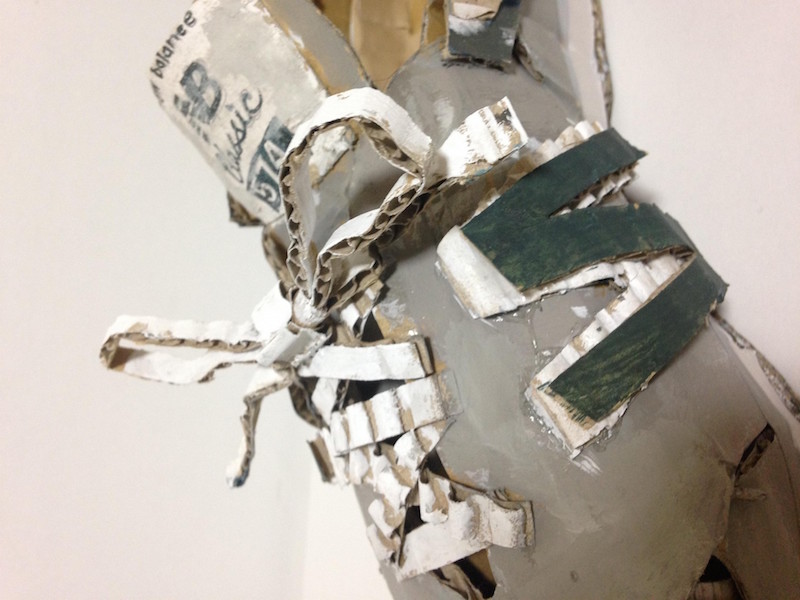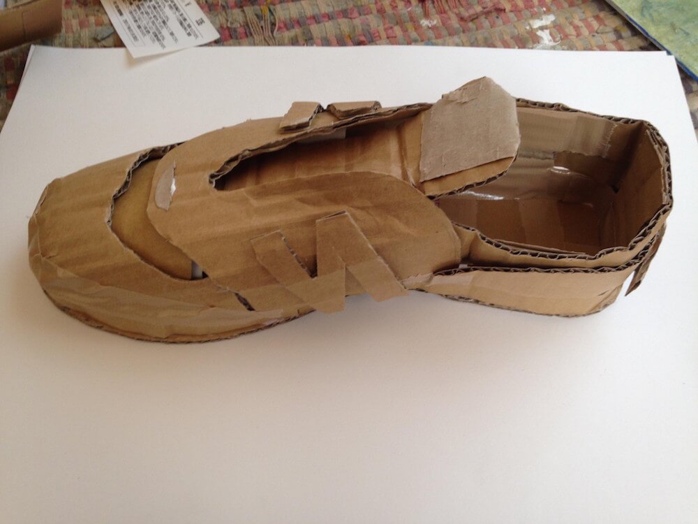 段ボールを組み合わせて強い骨組みを作ったり、立体的に接着しながら制作します。モチーフは身近なもの(くつ、家など)で構造が理解しやすいものが良いです。