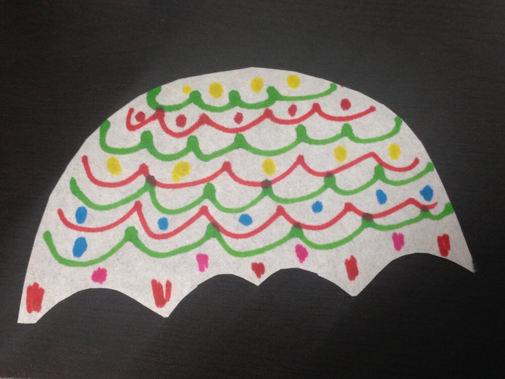 雨がぽた、ぽた降ってきた~(筆でぬらす) わあ、すてきな傘のもように変身!