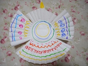 コーヒーフィルターにクレヨンや水性カラーペンをつかって鳥の顔を描き、模様をおしゃれに描きます。