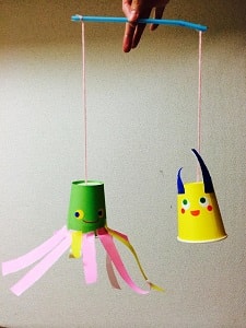 紙コップに顔を描いて、おりがみで手足をつけたり、飾りをつけます。 ストローと毛糸をつけて、ストロー部分を持ってゆらすとふよふよ動きます。
