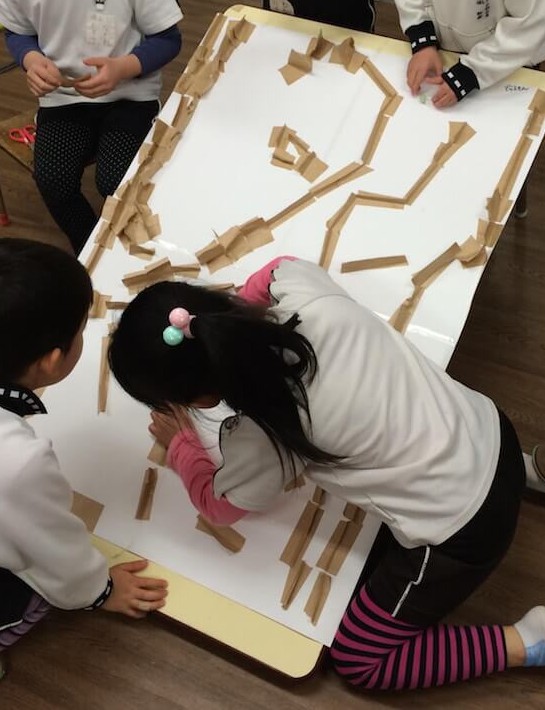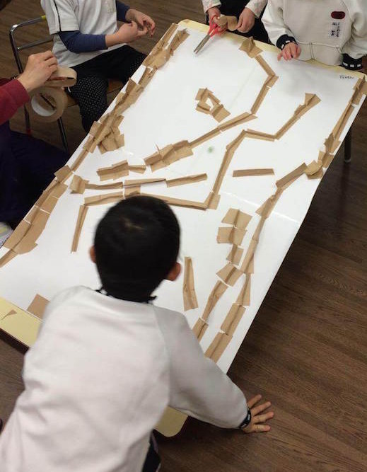 机に大きな紙を貼り、その上にクラフトテープで道を作っていく。途中で机に傾きを付けてビー玉を転がして遊びながら作っていく。●注意点机の傾きを作る際には事故がないように行う。