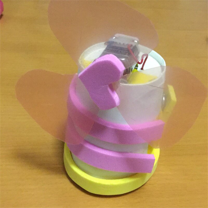 ①モーターを繋いで回路を作成したあと、土台になる紙コップに組み合わせよう