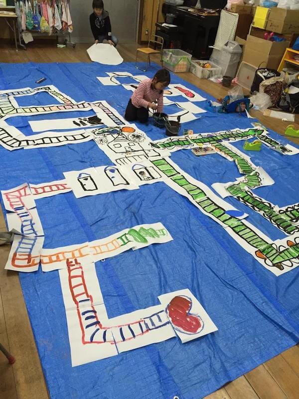 (線路)、コピー用紙、墨、水彩絵の具、ブルーシートなどで養生をしっかりする、(乗り物)、段ボール、水彩絵の具、おりがみなど、セロテープ
