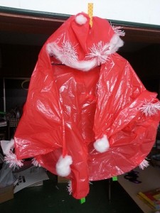 ほかの袋の部分を切り拡げ、フードの部分をセロハンテープではりつけます。