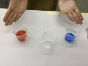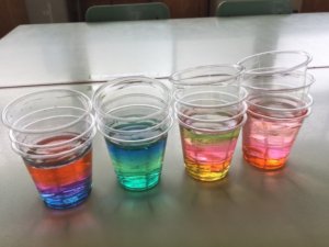 ほんの少しずつ色水の入ったカップを、違う色同士重ねていくと色の層ができます。水を入れすぎるとあふれるので少しだけ入ったものを重ねるのがポイントです。