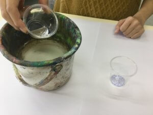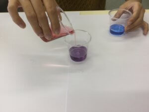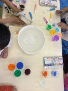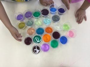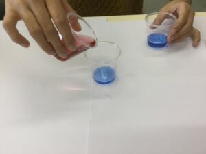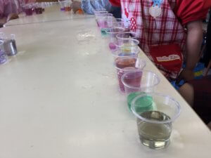 自分で色水を作り、混ぜていくことで混色を体感するカリキュラムです。