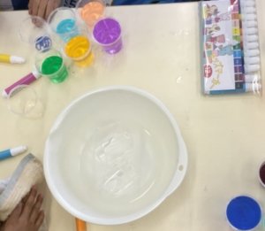この頃には何度も遊ぶうち、どの色とどの色を混ぜるとこの色になる、ということがだんだんわかってきます。色の種類も増やし、あの色とあの色を混ぜるとどうなるかな?ああなるのかな?というように、考える力や想像力も発達してきます。