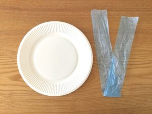 ・紙皿18センチ程度(1人1枚)、タコ糸などのひも(ここではスズランテープ使用)(50cm程度、1人1本)