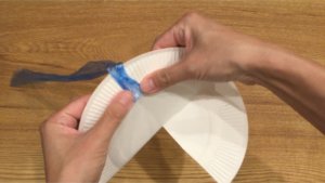 紙皿の後ろからセロハンテープで紐をつけます。