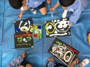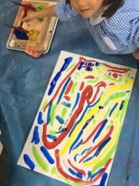 ・大きなストロークで絵を描く事はお家ではとても出来ない経験です。クレヨンやペンのように手先ではなく、肩からの動きや、体全体を使って描く事の楽しさを味わう。