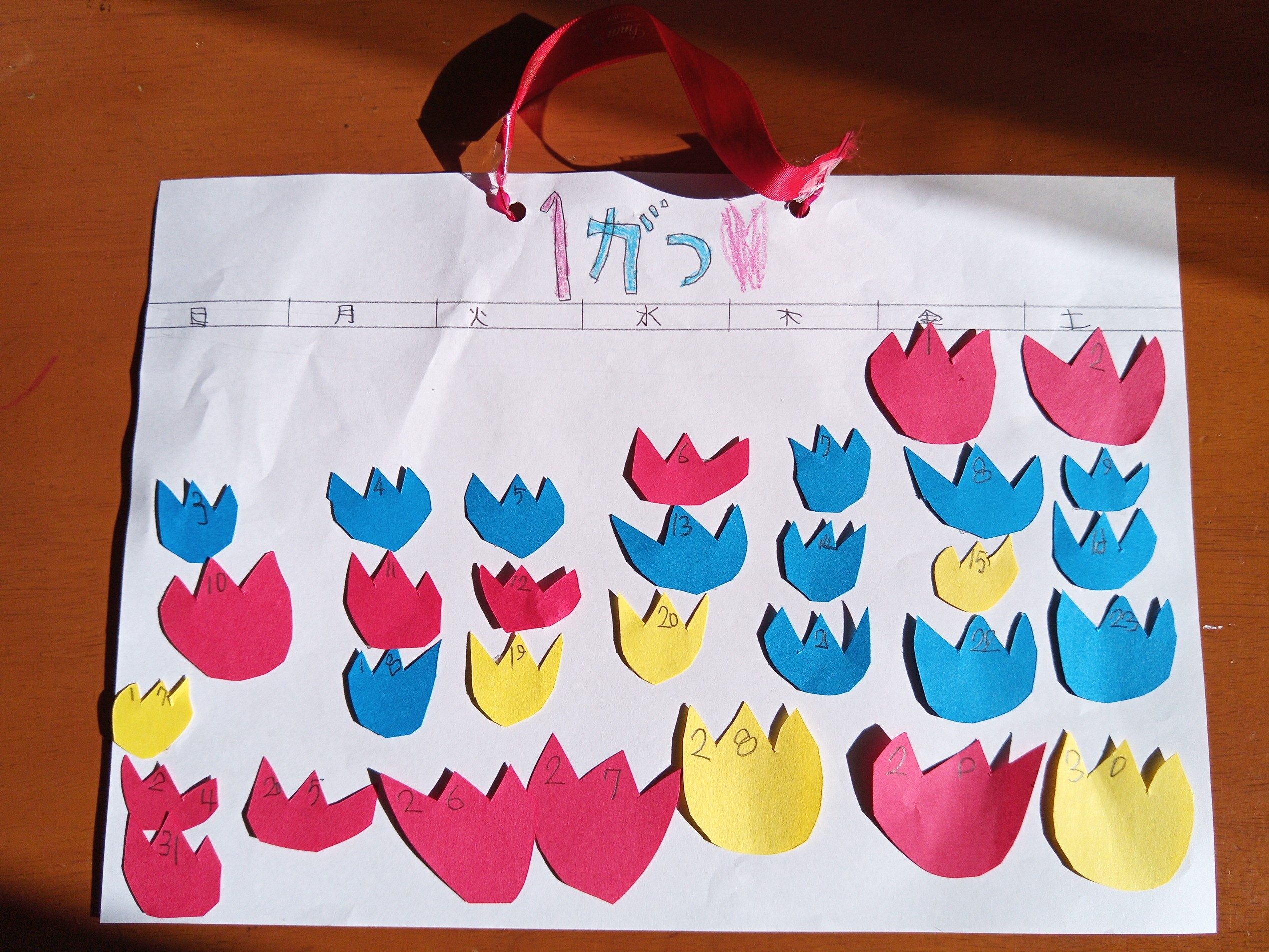カラフルでたのしいカレンダーだね! がようしをきりばりするというアイデアもすごい! かくよりもきってはりつけるのをえらぶなんて、すごいこだわりですね。