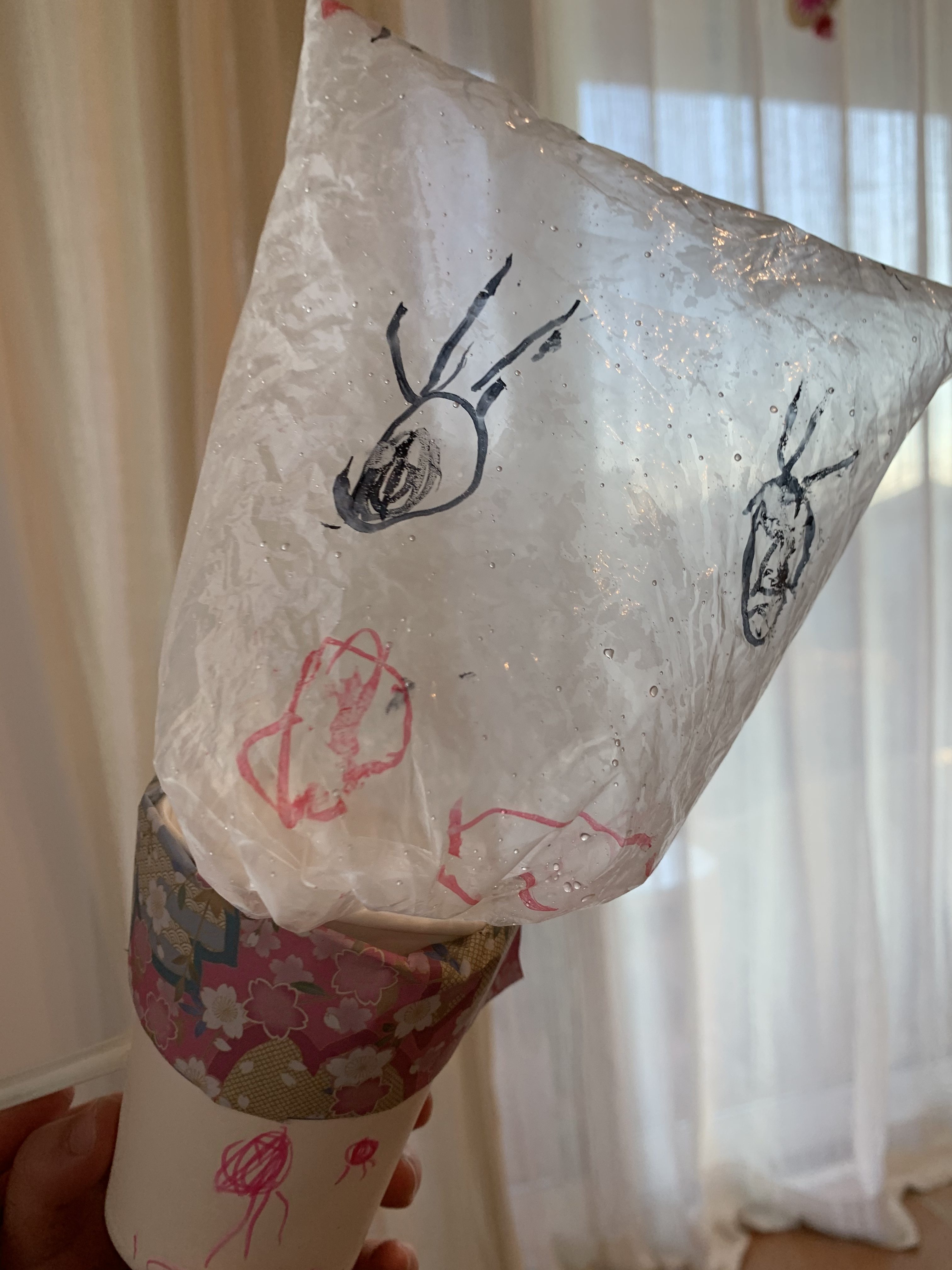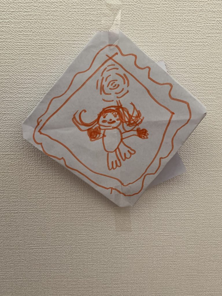 くるみちゃん、ありがとう! つめたいあめがふっていておうちでおえかきしたんだね! おかげできょうはおてんきもよくてあったかくなったね! おばけちゃんのおめめがぱっちりしていて、かわいいね!