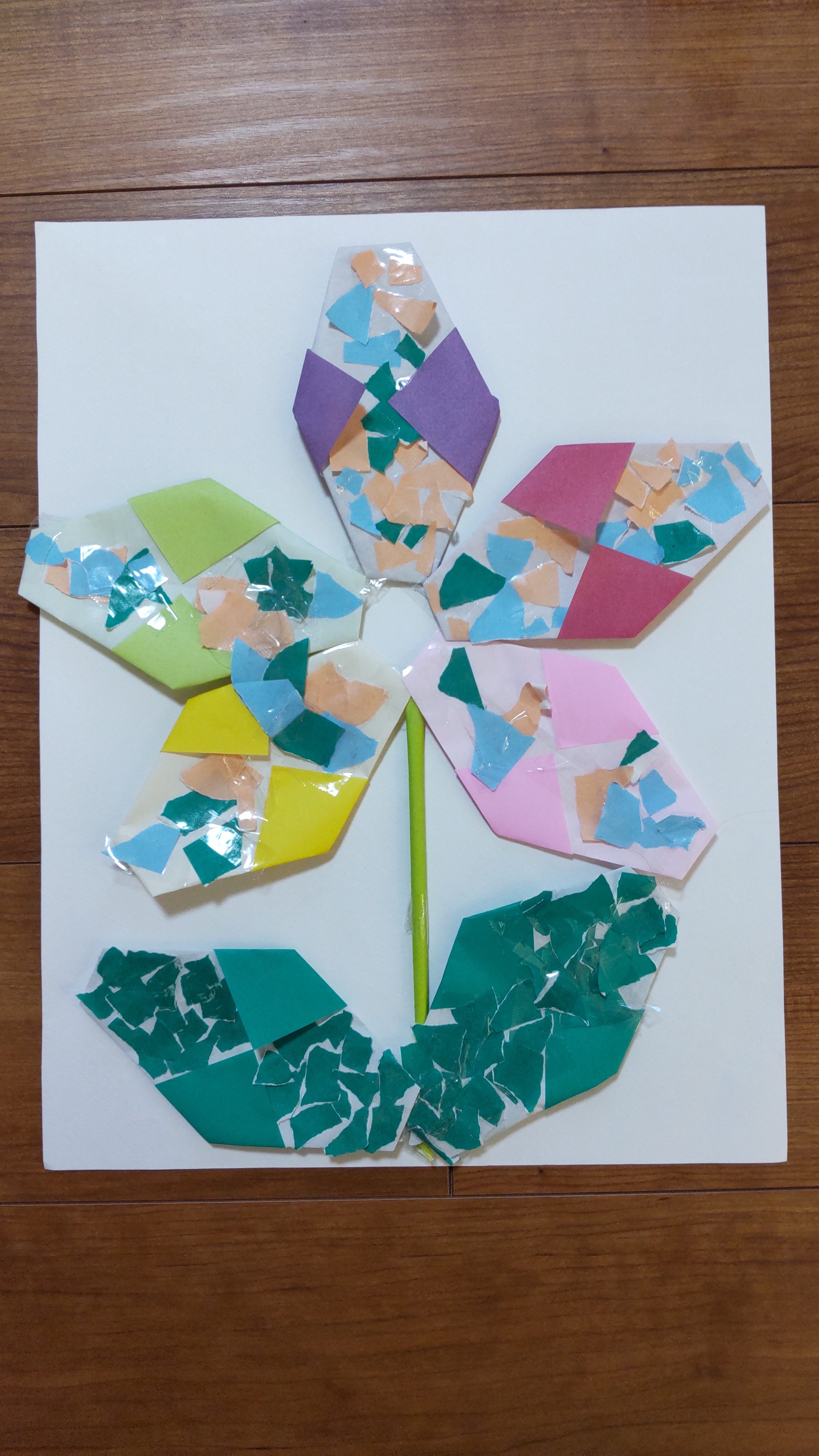 さいしょは はなびらだけを つくっていたけど、たのしく なってきて、くきや はっぱも つくってみました!