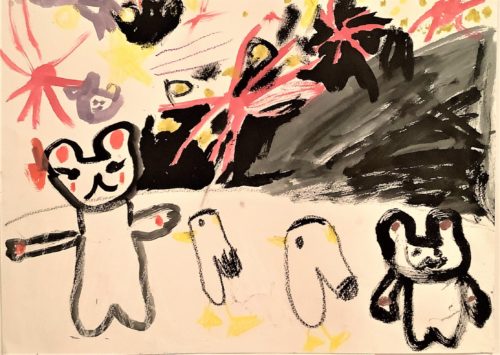なんきょくという、さむ~いちいきで、きれいなはなびがみられたらとってもすてきだろうなぁ~~!!うさぎさんもとりさんも、みんなたのしそうにはなびをみていて、あたたかいきもちになりました😊