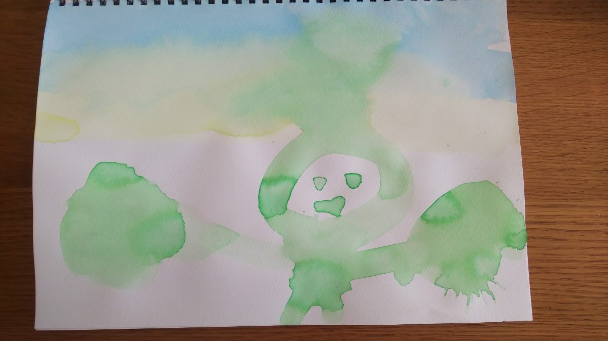 ①『木の妖精?』上から水色、薄黄色のグラデーション。色味が気に入らないと、画用紙に水気を足して、伸ばしました。木の妖精かも?は、淡い緑。