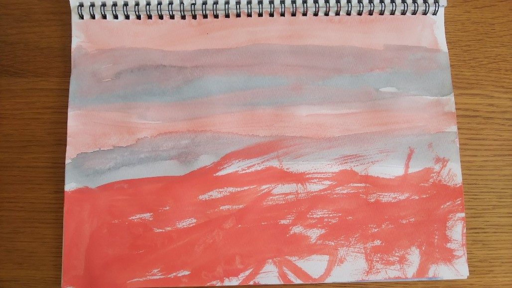 ③『ピンクのあさ』ピンクと言うより、朱色+多少の白と、灰色と、濃いめの朱色。頭をフリフリ、オンライン参加しながら、一気に仕上げました。(新聞紙敷いても、周りに絵の具飛ばしながら・・苦笑)