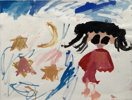 しおりちゃん、いつもびじゅつきょうしつきてくれてありがとう。えのぐでげんきいっぱいおえかきしましたね。かみのけのかたちやおほしさまやおつきさま、たのしくおえかきできたね! どんどんおえかきじょうずになっていてびっくりです! また、かわいいおえかきみせてね。