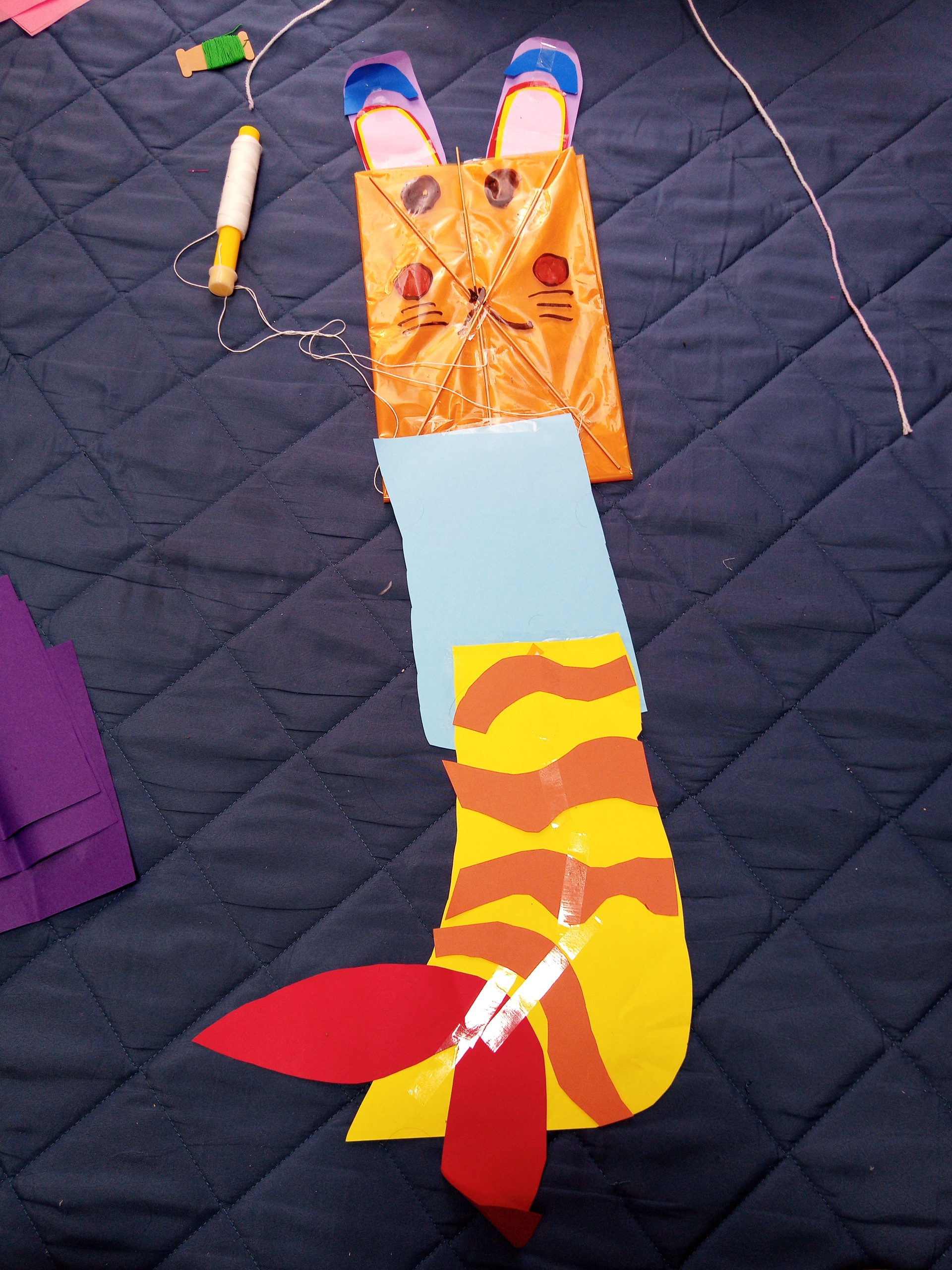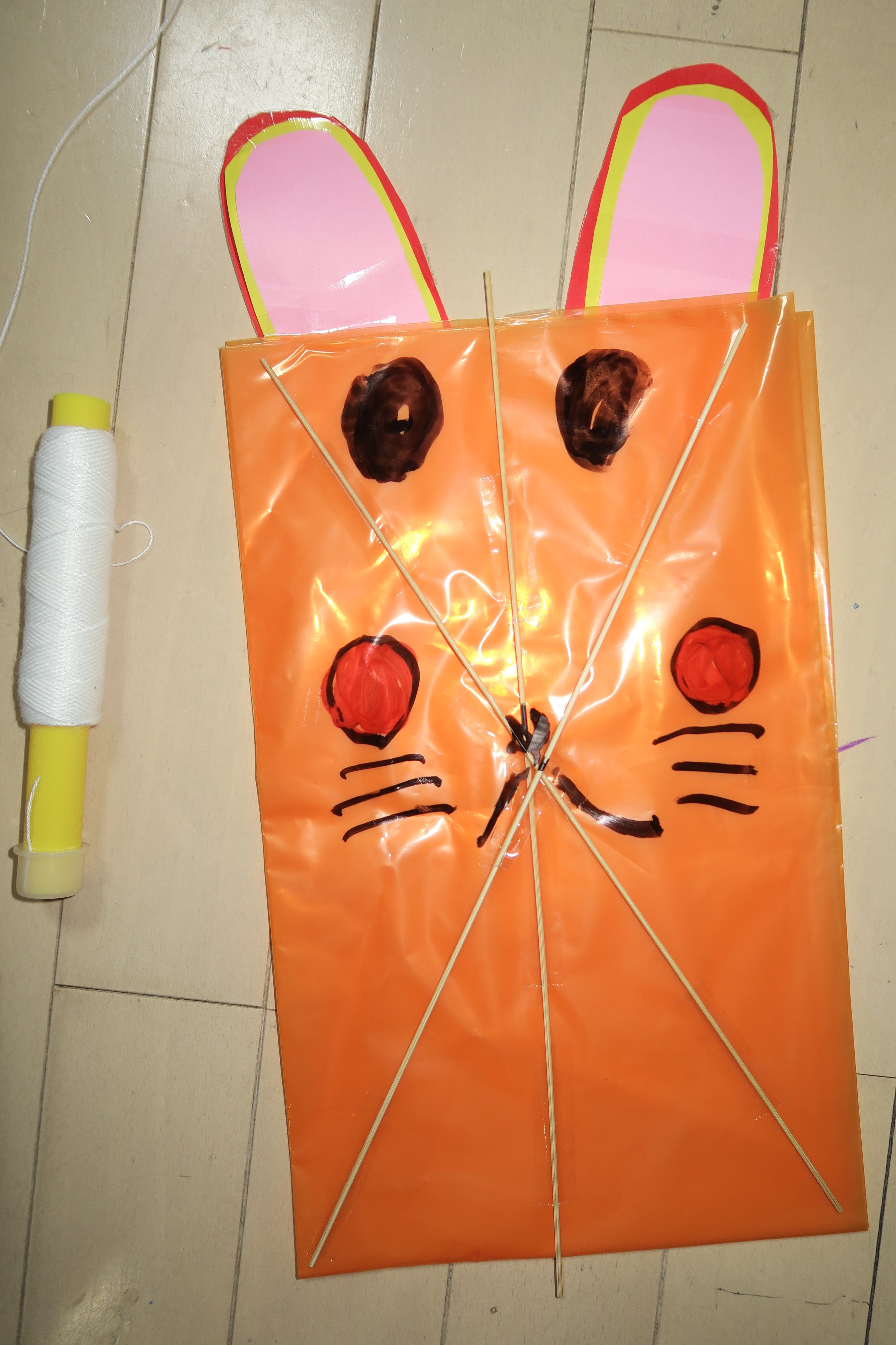 最初につけた耳(ピンク色)は短いと感じ、少し長くするために、折り紙を付け足しました。