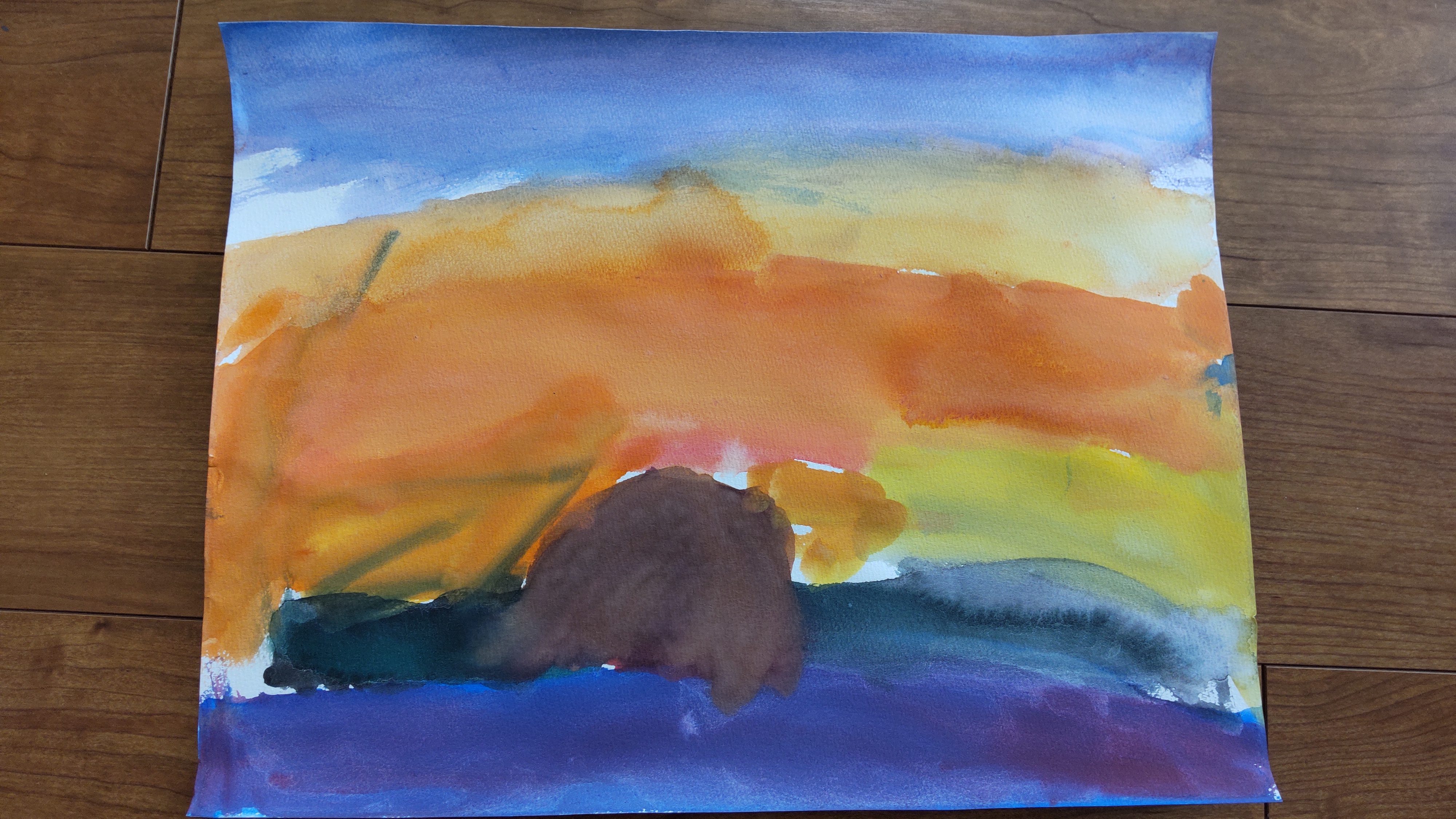 さきちゃん、えのぐのいろが めっちゃキレイだね! ゆうひのいろがなんだか、すごくうつくしいよ! ゆうひがしずんでいくかんじがする!