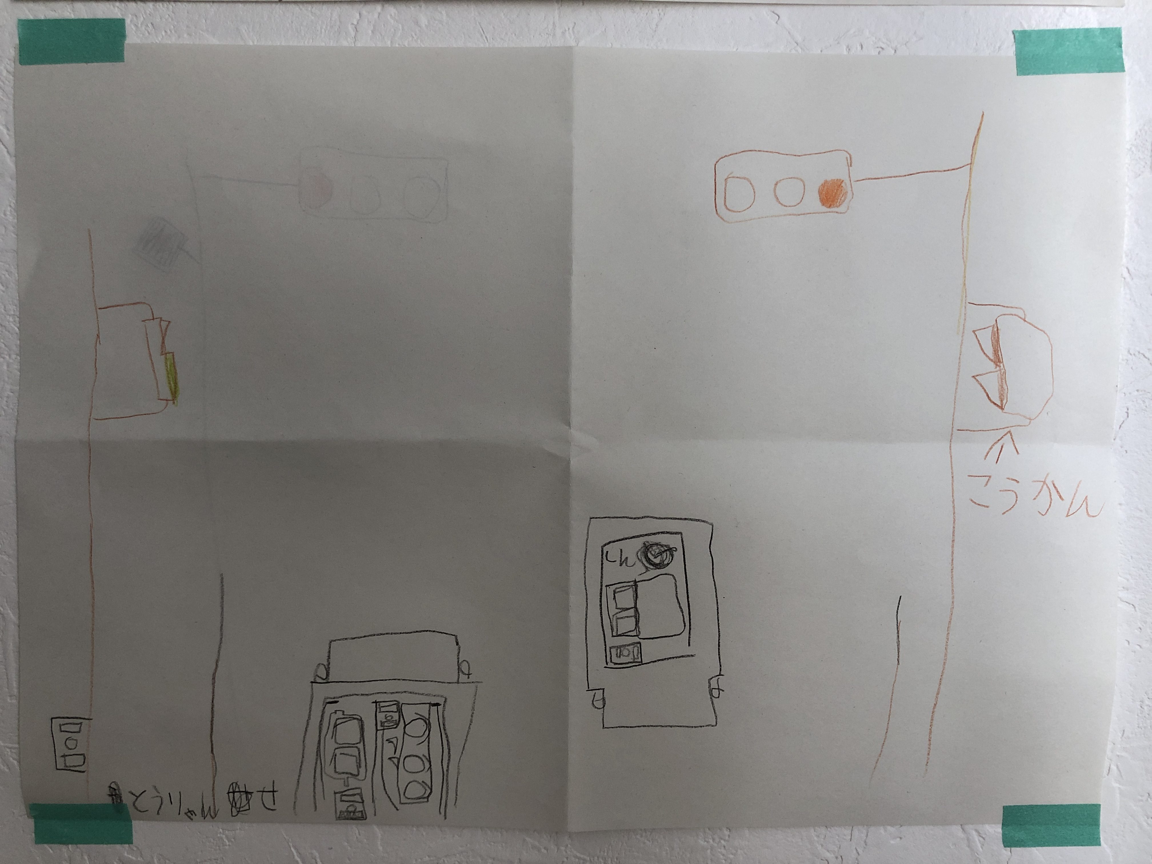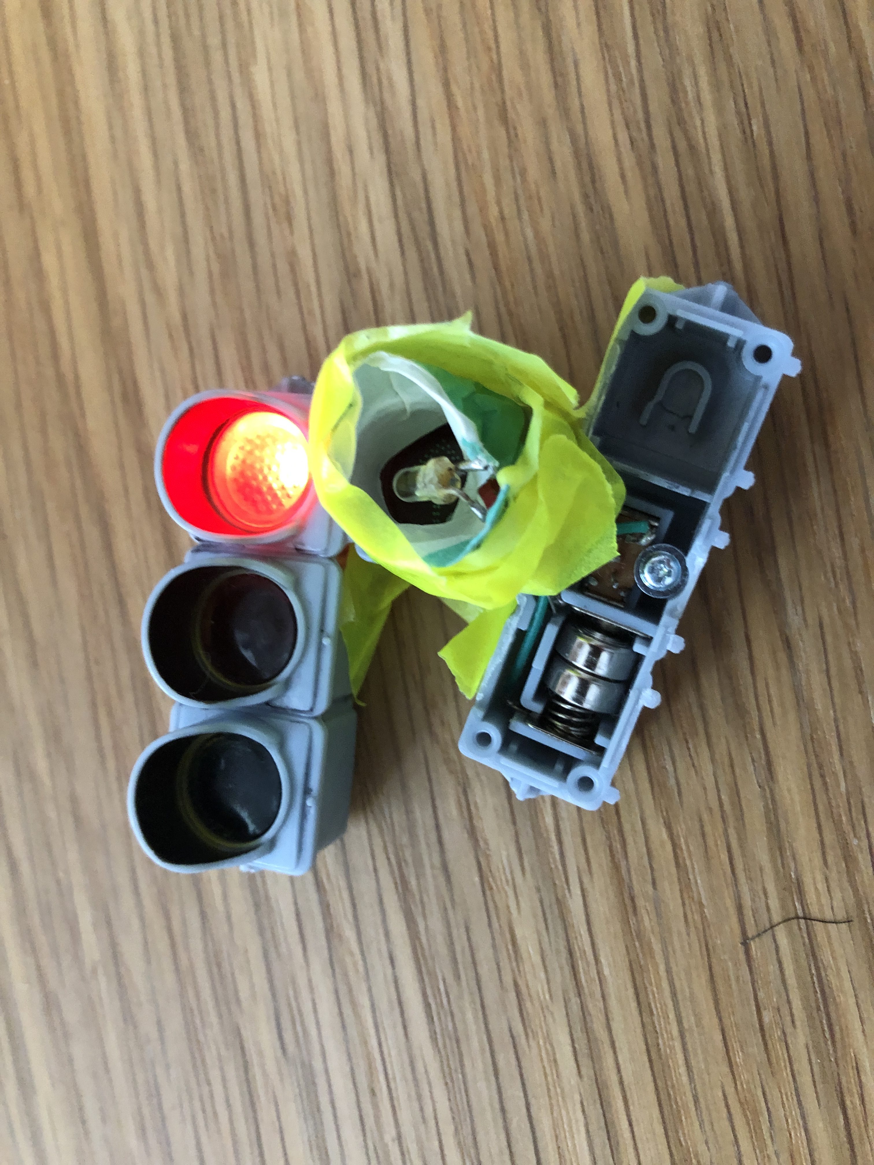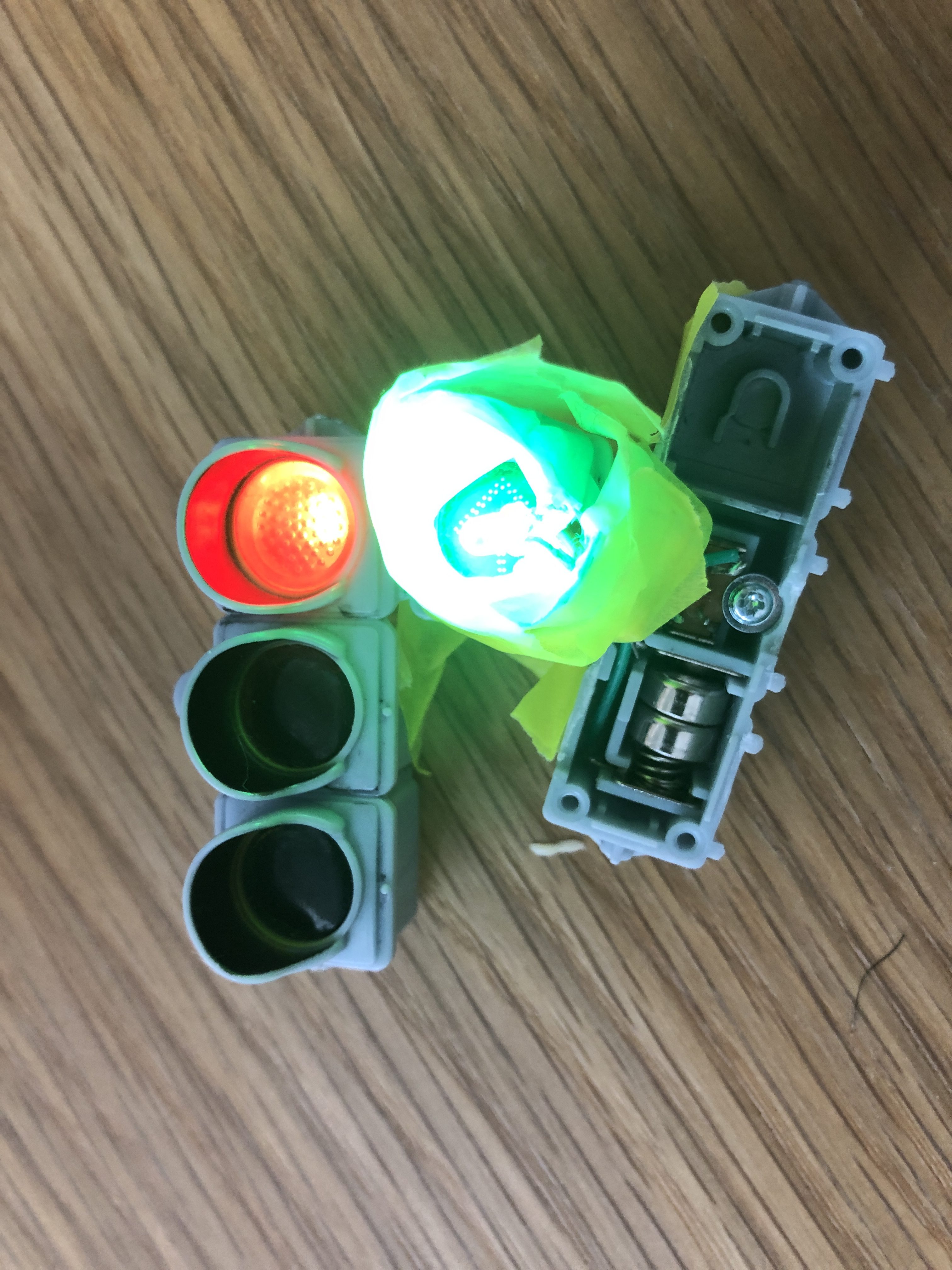 信号機のおもちゃは自分で分解したりカスタマイズしたものです。(光るようにつくられていない矢印部分に電球を差し込んで、マステでルーバーをつけてます)