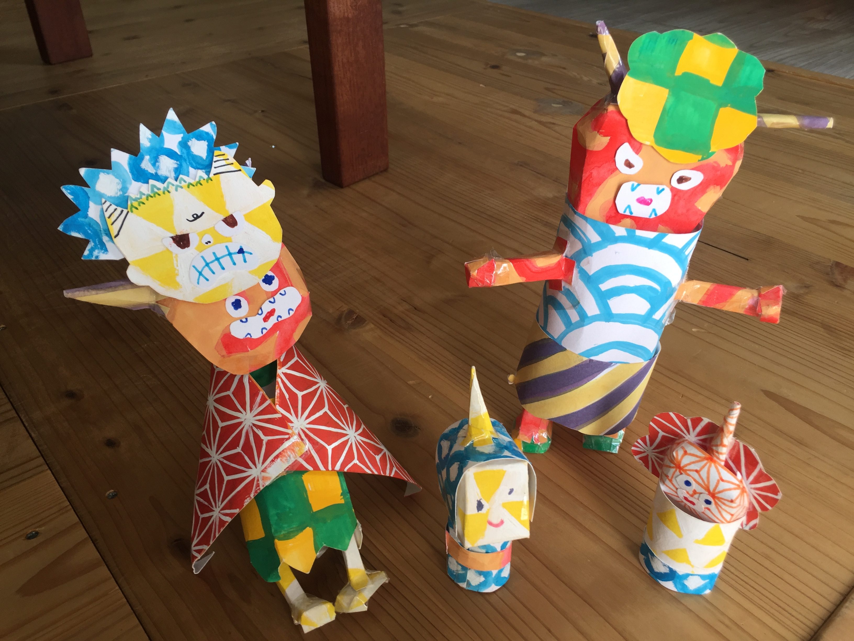 右が怒りんぼ鬼 左はビビリ鬼。(お面で泣き虫を隠してます) 下は、ちびちびおに。 ちびちび鬼は、余った柄の紙で作りました!