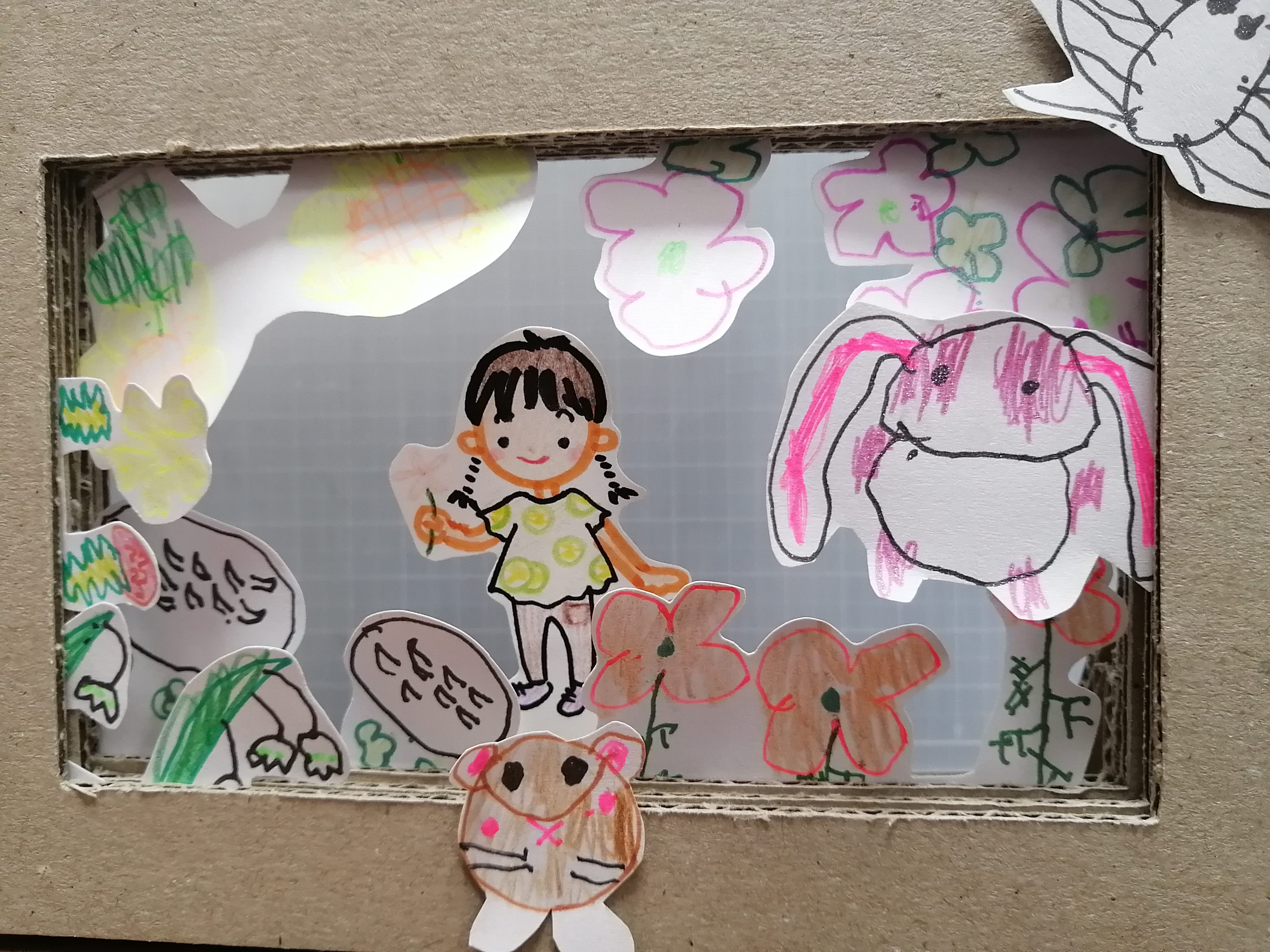 段ボールを額縁にして、1枚ずつに動物や花を貼り、遠近感を出しました。