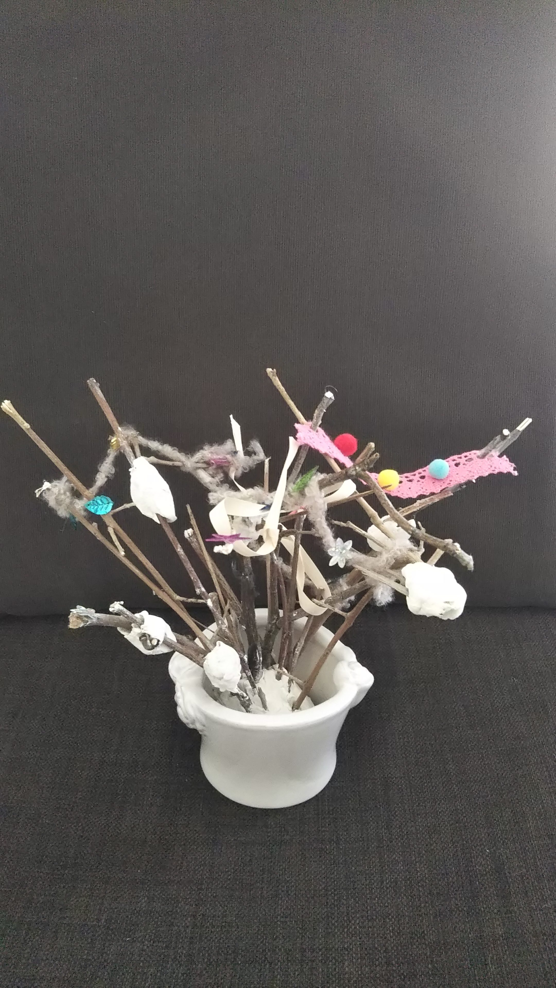 えだをつなげる役目をリボンがになっているわけですね。おもしろい! こういうツリーもステキだね! アリ!