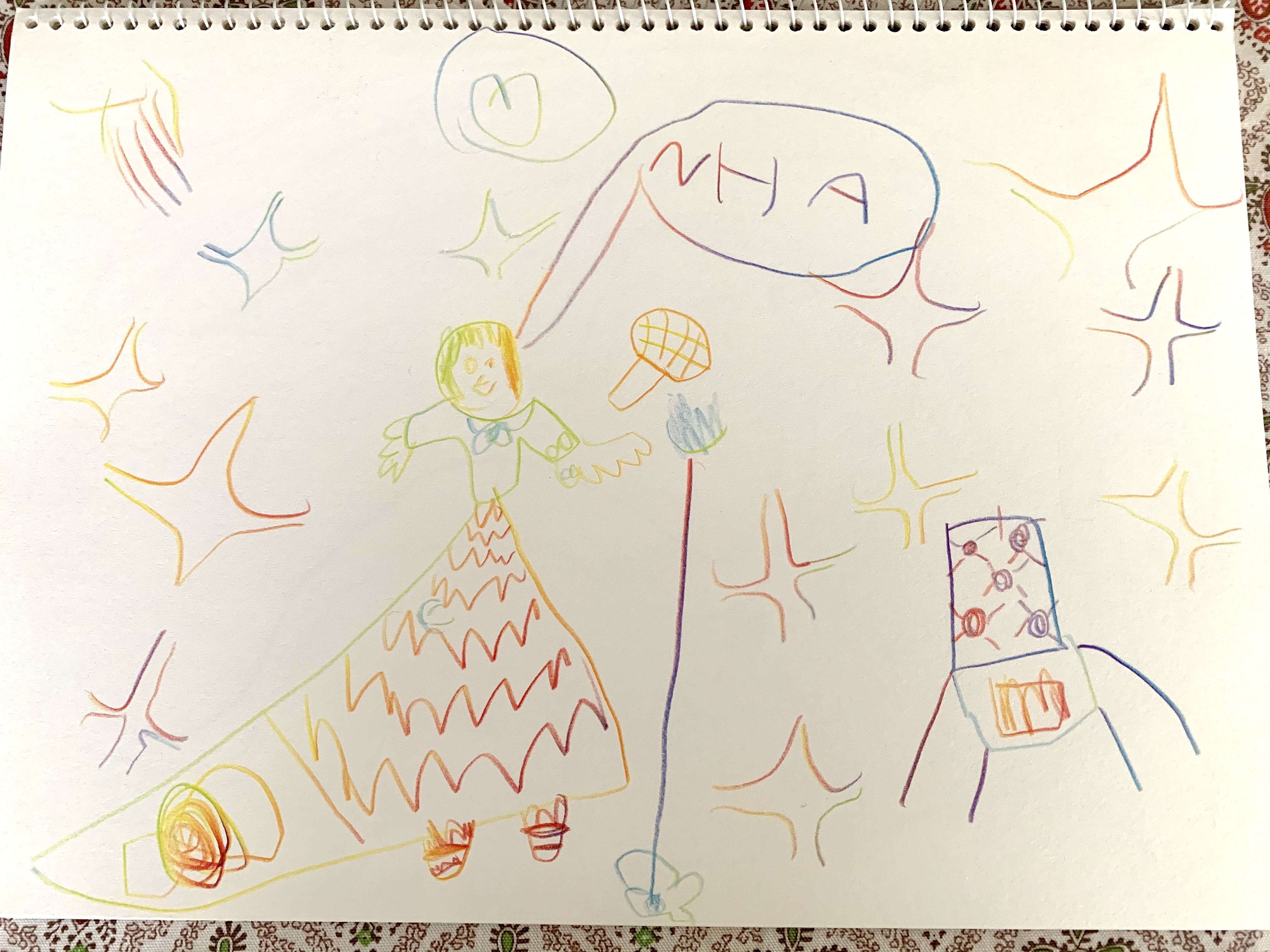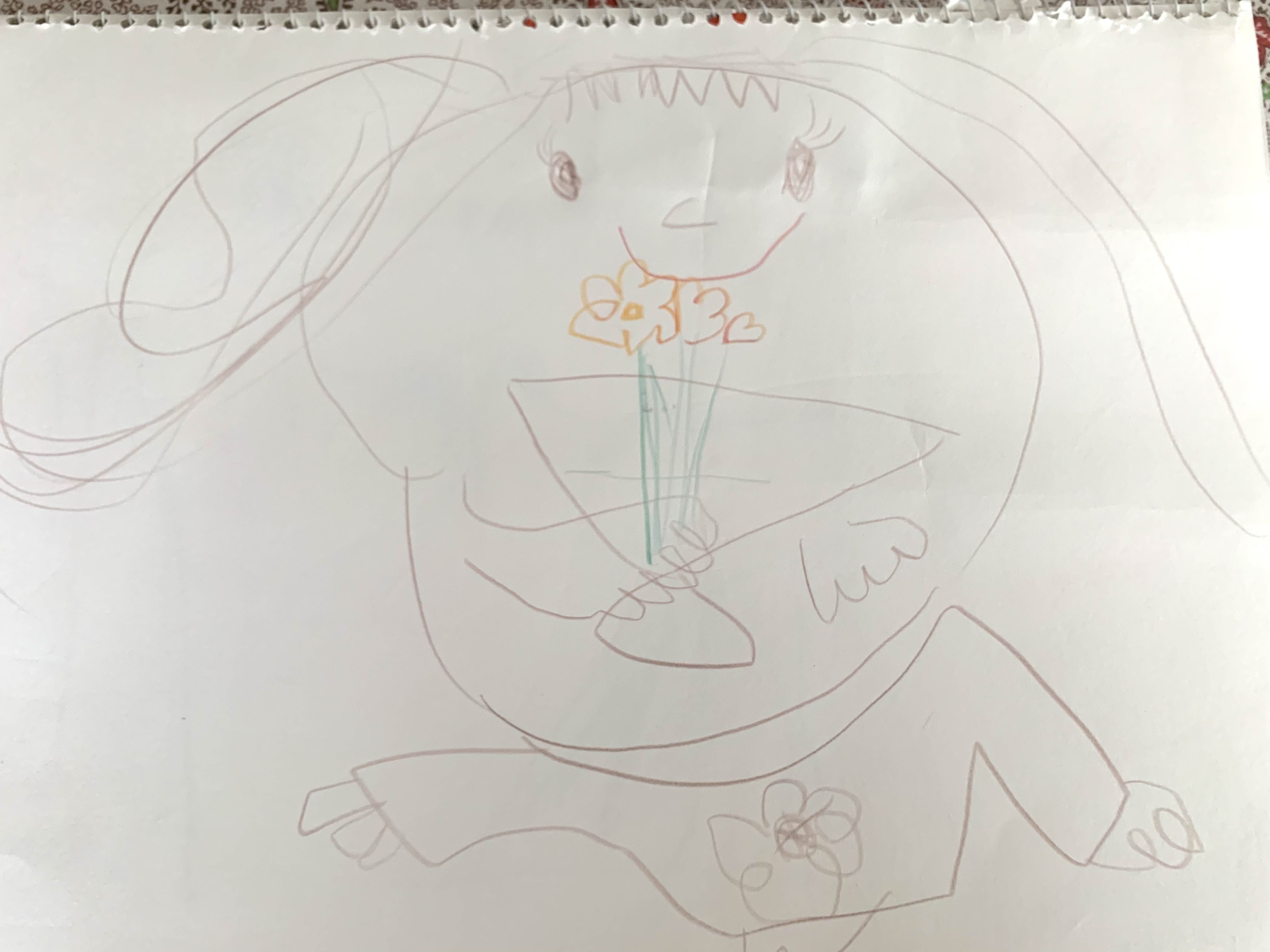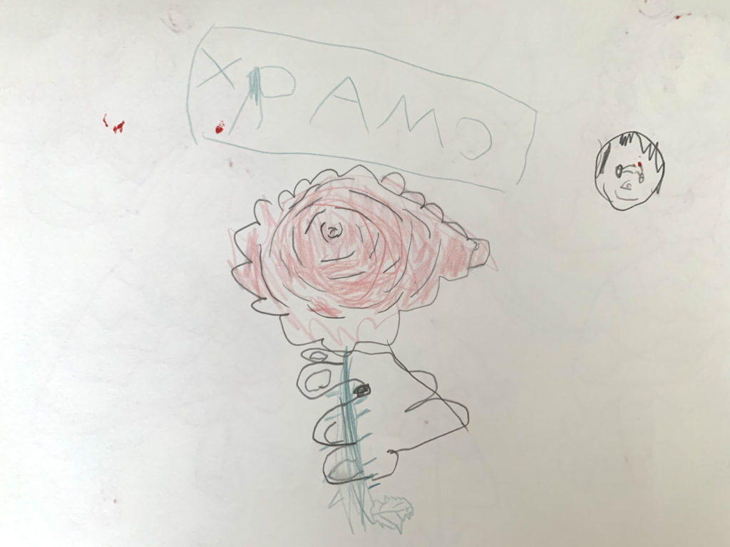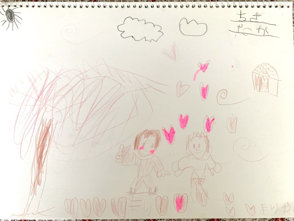 バラの花を手で持っている絵は、私もお父さんも少し驚いて「何か見て描いたの?」と聞いたのですが、「庭のバラを描いたんだよー」と言っていました。手で持つところを描くのは難しそうなのに、幼いがゆえなのか、臆せず自由に描いているのが素敵だなと思いました☺️