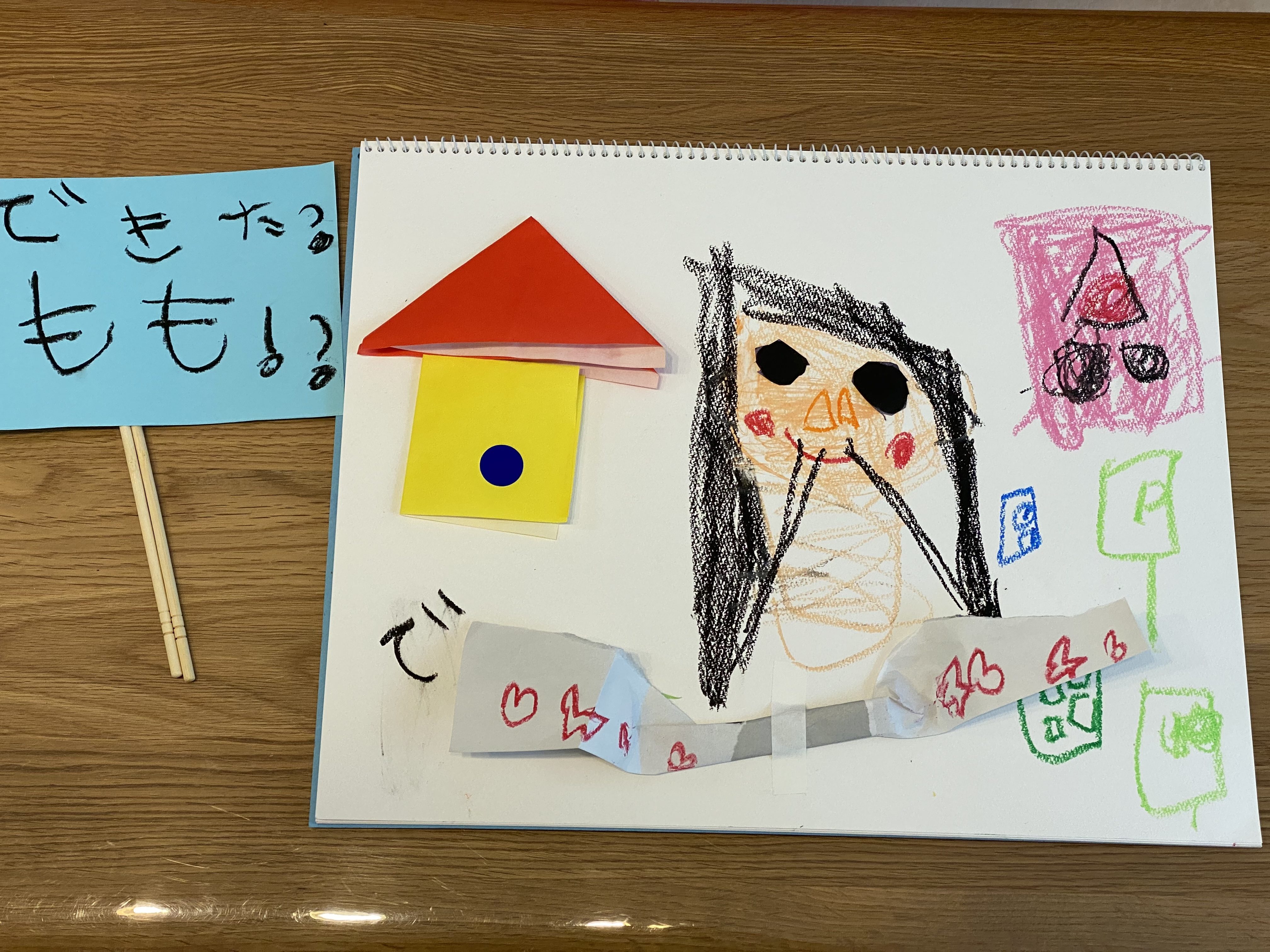 ももちゃん サイコーだね! ステキなリボンができてるよ! コンビニのおにぎりとのりまきは シモダンせんせいもたべたくなっちゃったよ! できた?もも!?は、zoomのときにつかうプレートかな? たのしいアイデアがいっぱいだ!
