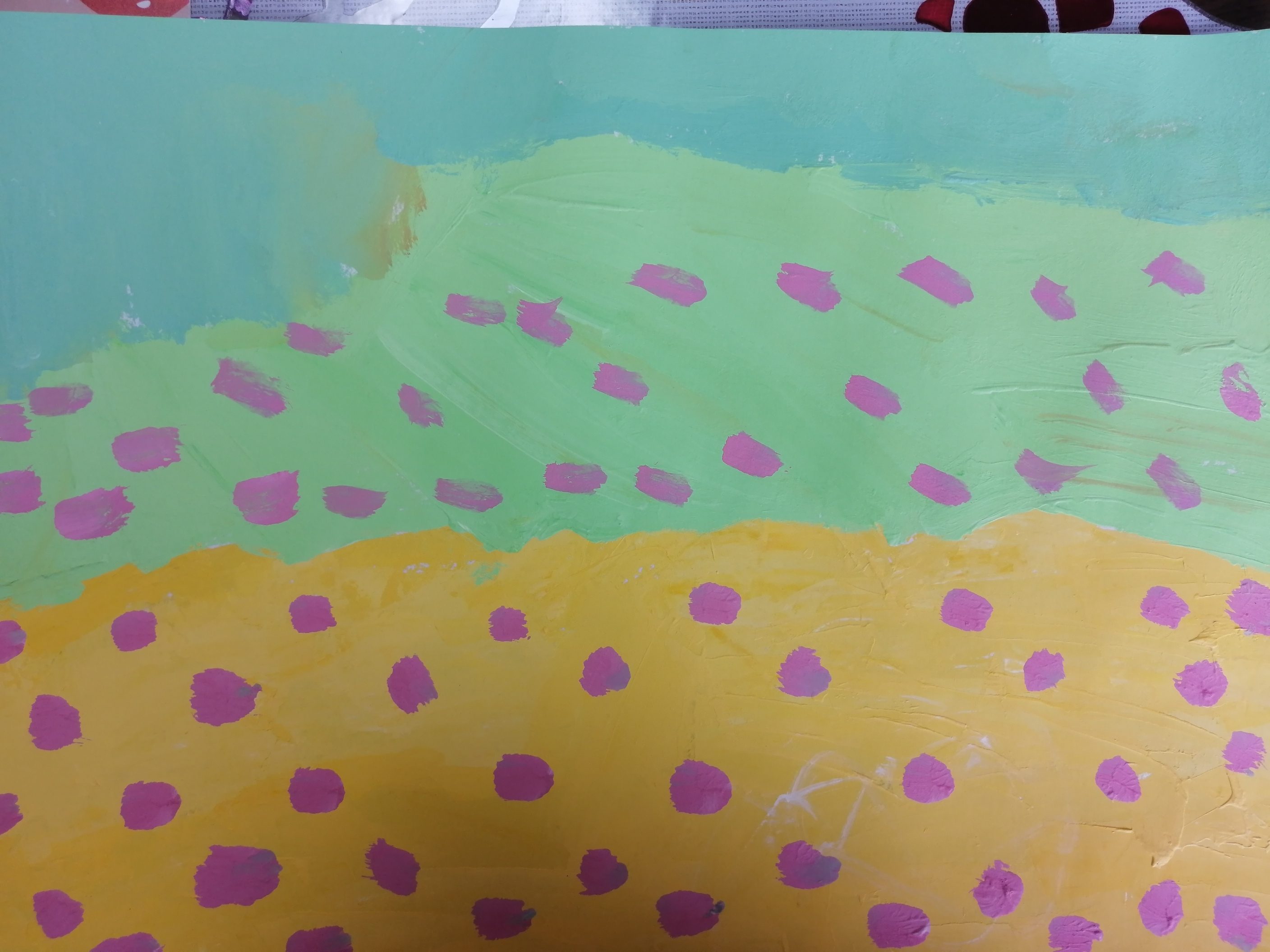 2枚とも、水玉もようがありますが、かせねてかいたものと、ぬりのこしてかいたもので、かきかたをかえたんですね。おなじ水玉でも見えかたがちがいますね。
