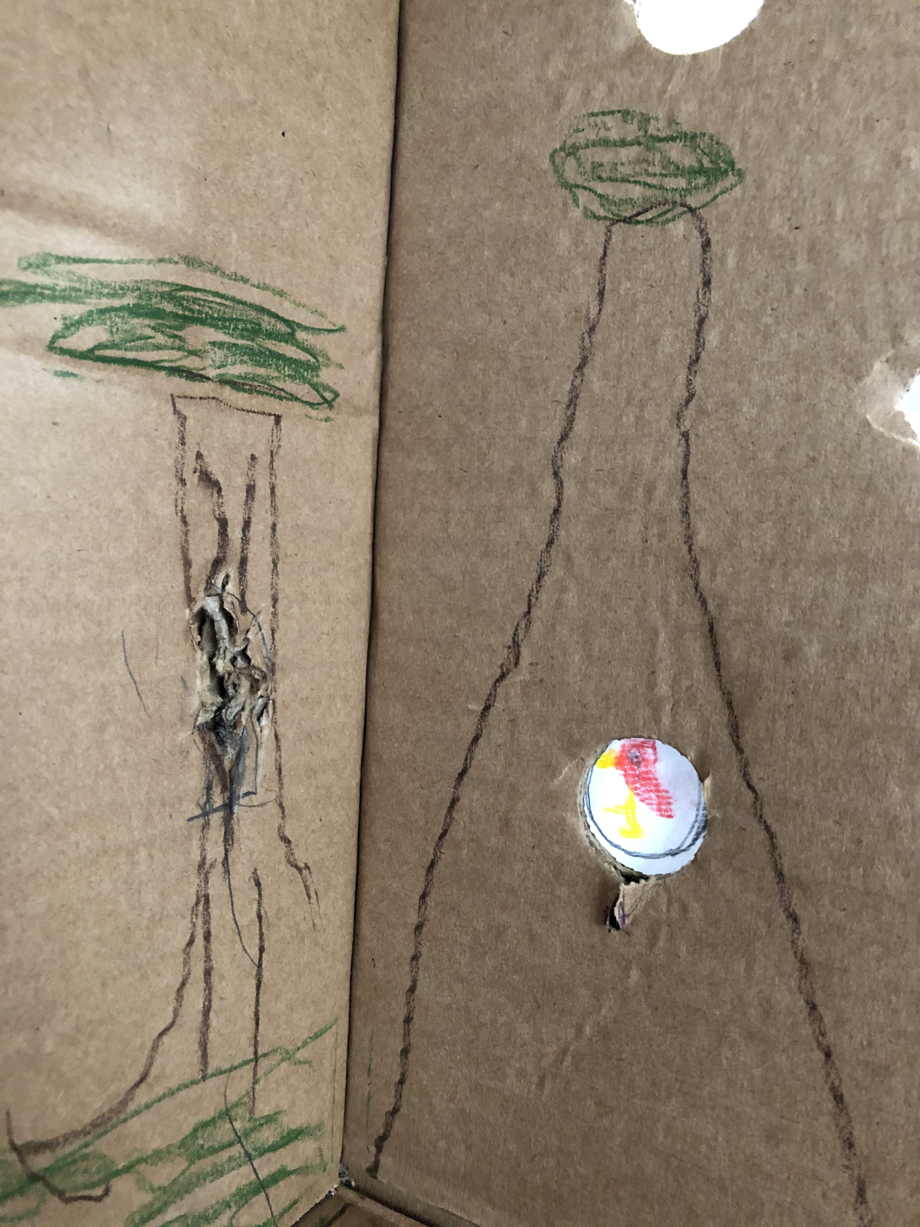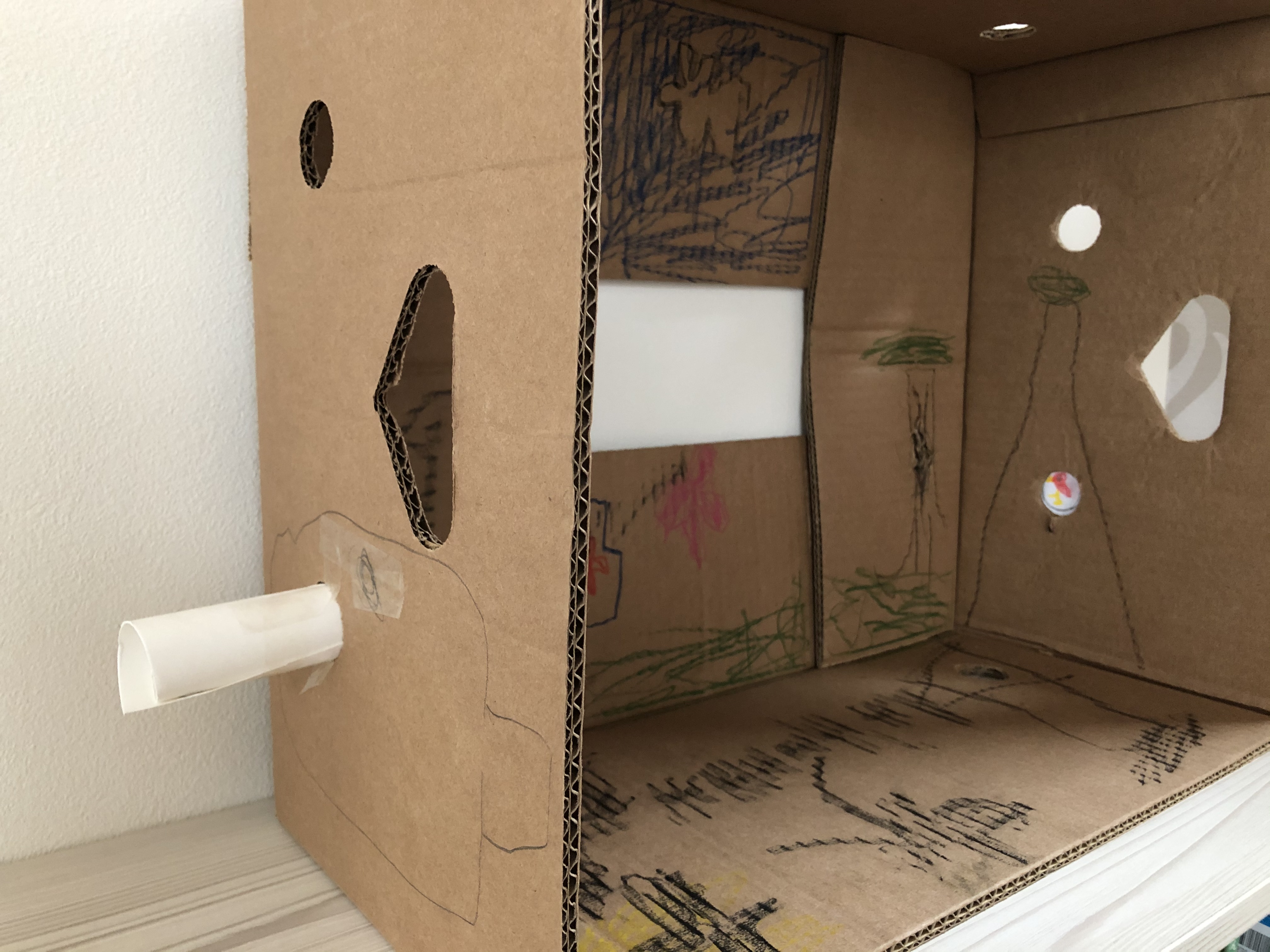だんぼーるばこの中に外の世界ができあがってますね! ふしぎなかんじがしておもしろい! あなをつかってのぞいてみるっていうのも すごいアイデアだな!