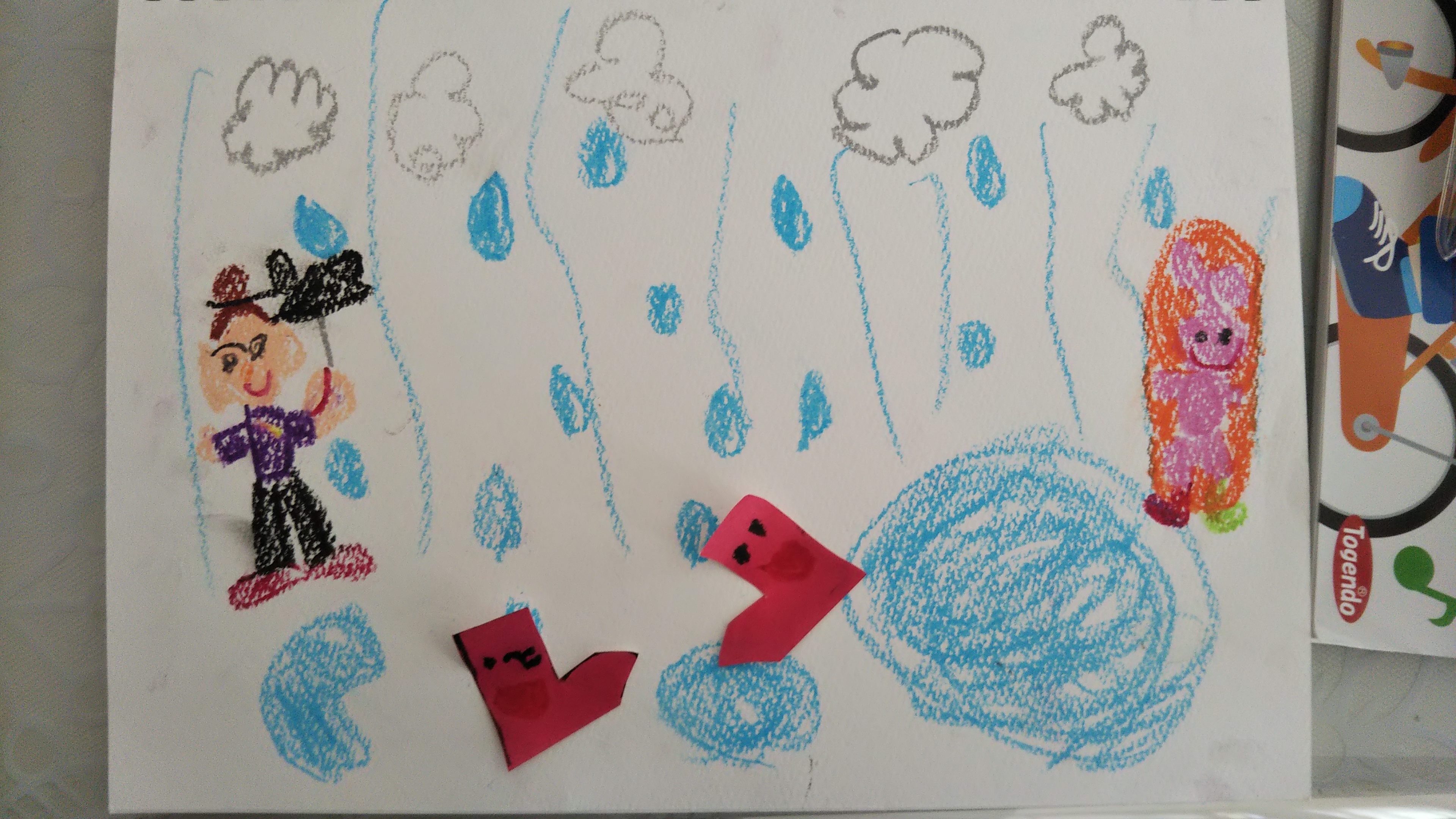 ながぐつちゃんも ながぐつを はいた うさぎちゃんも みんなであめのなか たのしそうに おさんぽしてるね。