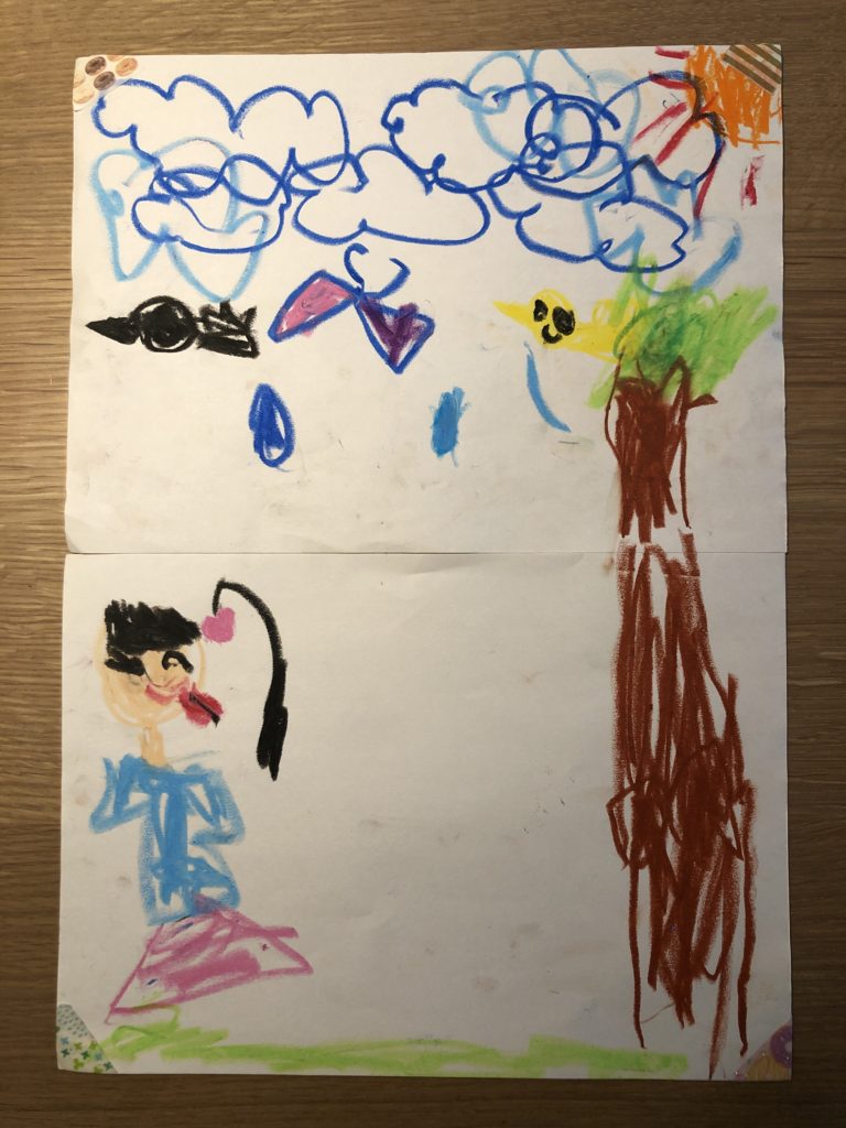 今日は雨だったけど、お絵かきの中ではお日様が元気でとりさんもうれしそう〜