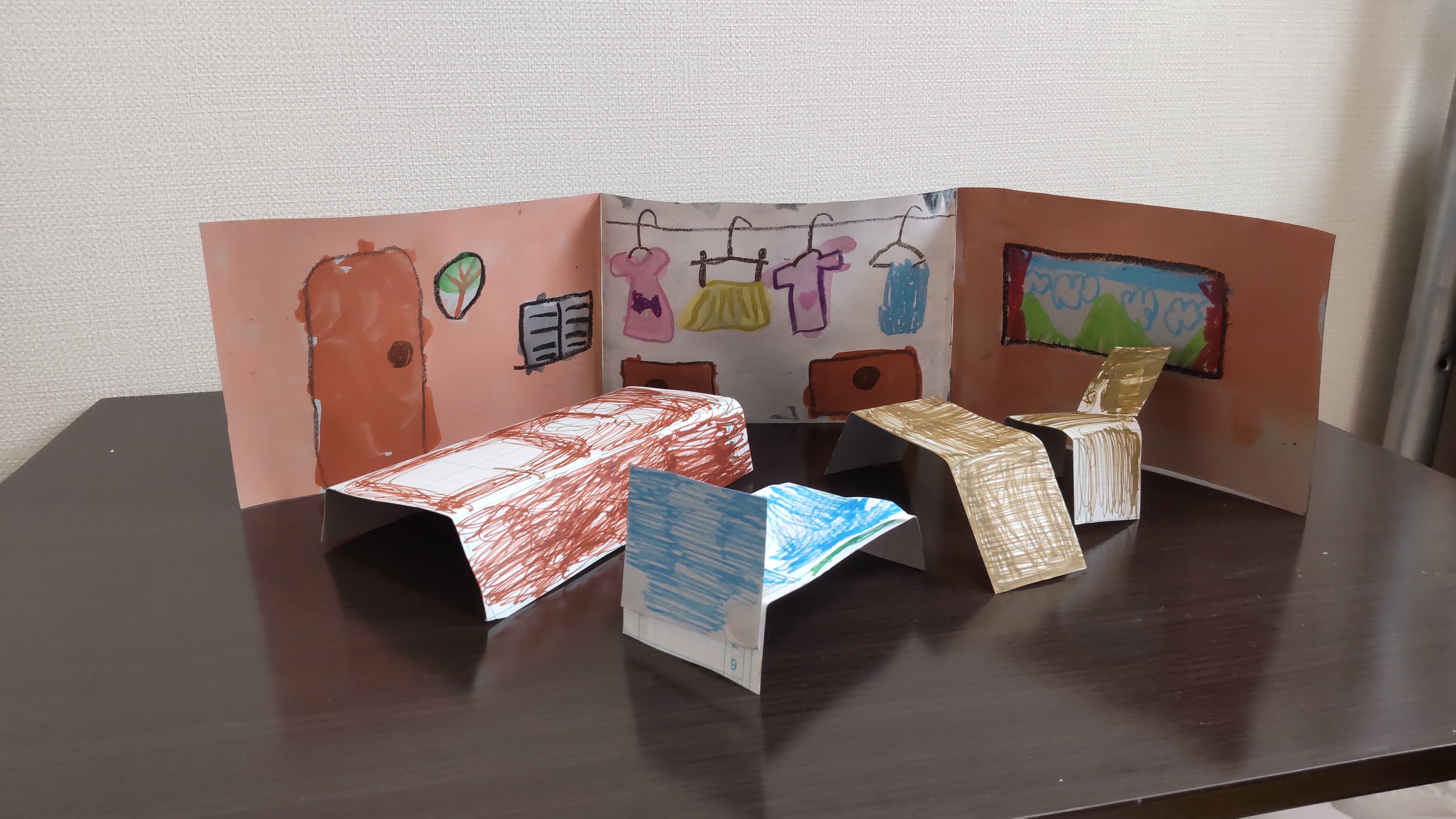 かわいいようふくがハンガーにかけてあったり、まどから外のけしきがみえていたり、ちいさくなって このおうちにはいってみたくなるね。ちいさな家具もていねいにつくっていて、これはたのしいね!