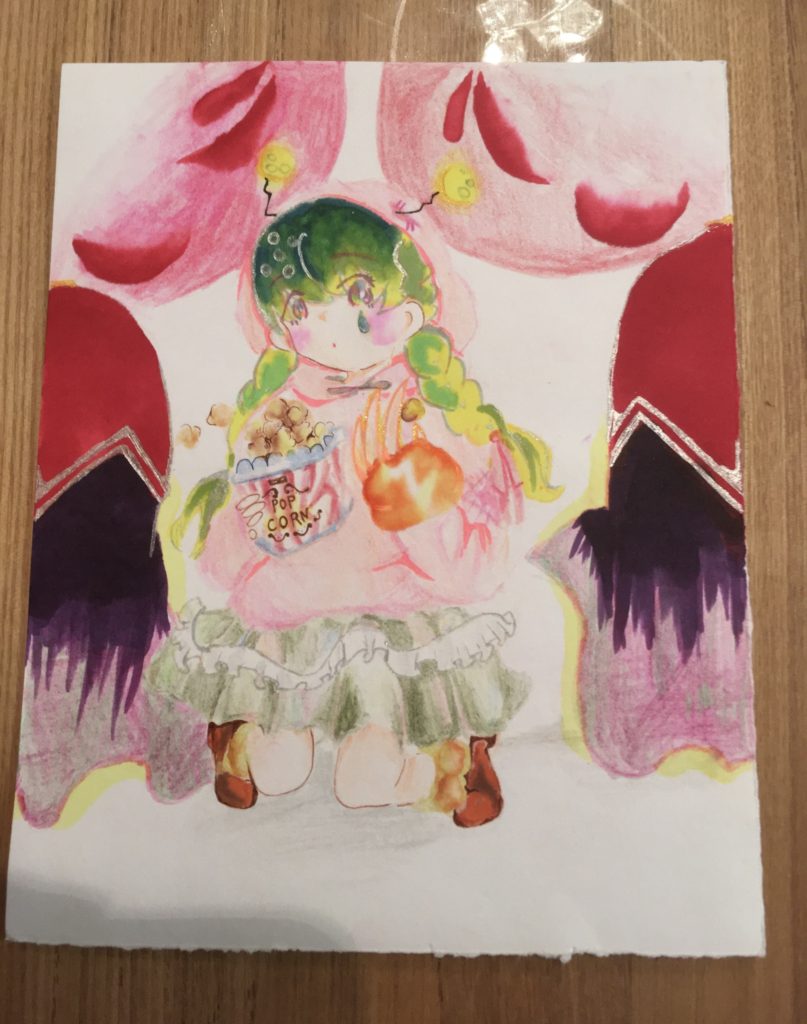 緑のスカートでもいろいろな色を使い、周りから光が当たっている様子をあらわしました。