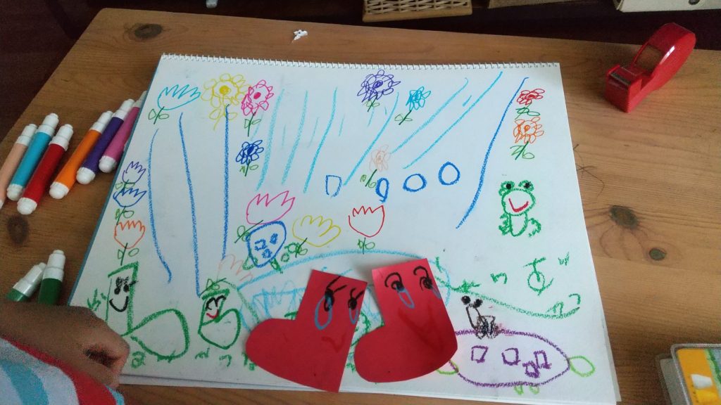 お友だち同士のながくつちゃん、季節に関係なくたくさんのお花と雨の中楽しく遊んでたら、おうちに帰りたくなっちゃった。(裏は泣き顔)