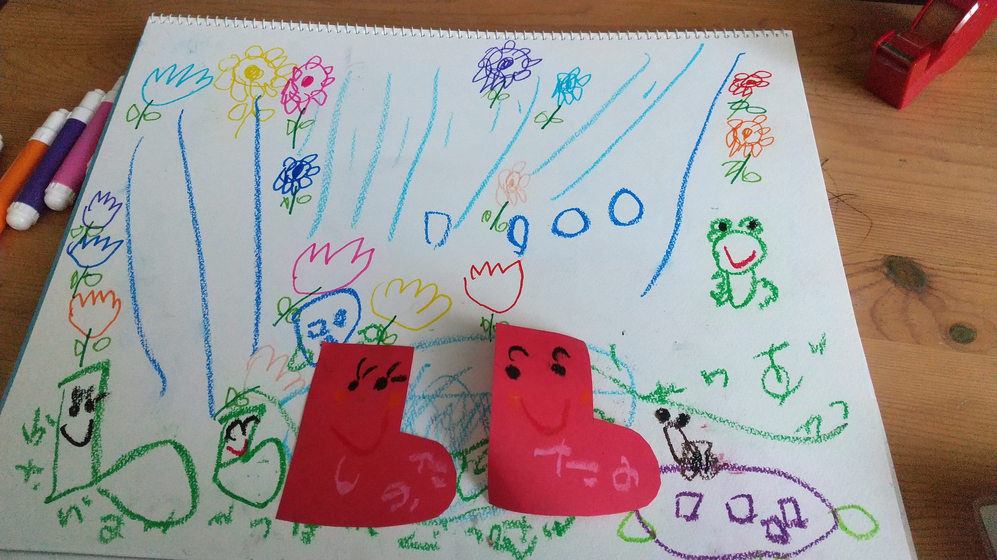 お友だち同士のながくつちゃん、季節に関係なくたくさんのお花と雨の中楽しく遊んでたら、おうちに帰りたくなっちゃった。(裏は泣き顔)