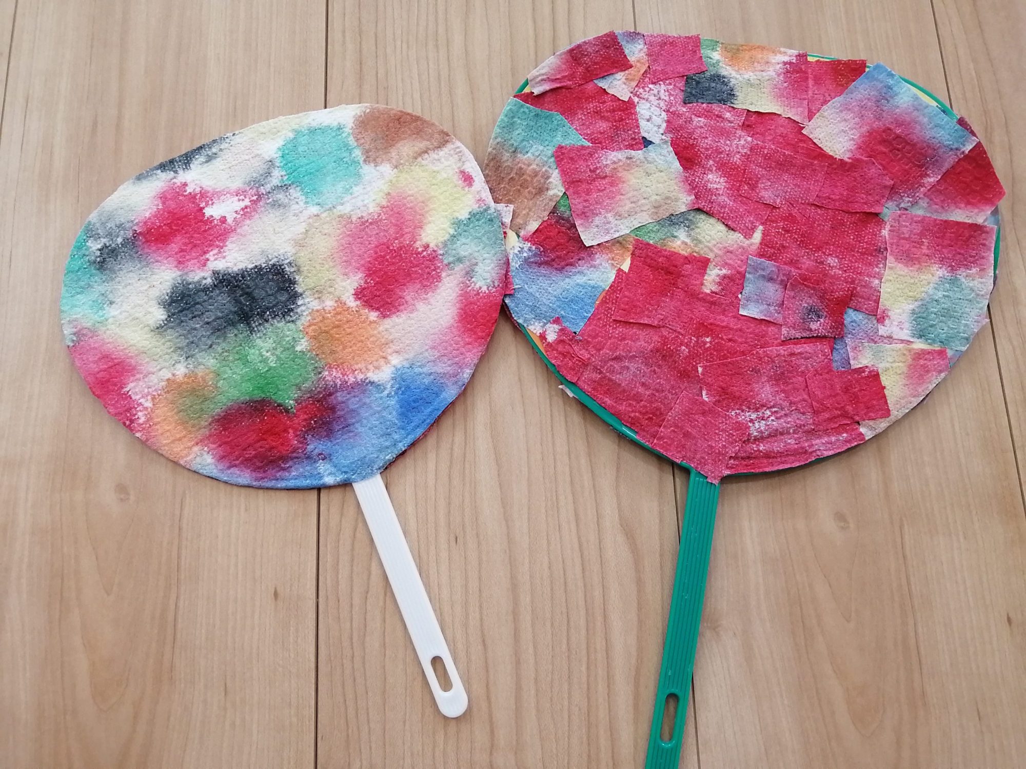 そめそめをこんなふうにうちわにはると、ステキだね! こまかくはさみできってからかさねてはっているのもたのしいね! こんなアイデアをおもいつくなんてすごい!