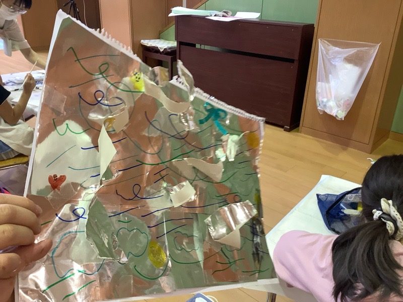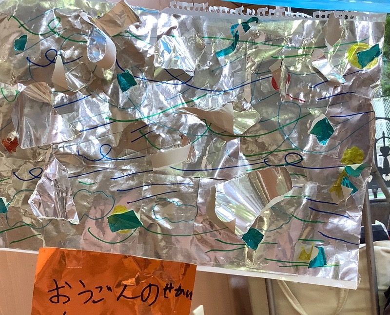 おりがみをちぎった時にできる「くるん」と丸まった感じをうまく利用しました! その風がひらひら動くと中から動物たちが 隠れています!