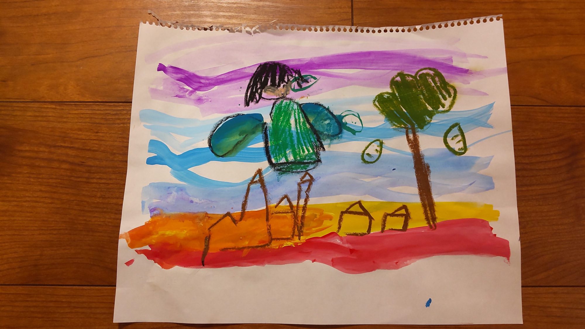 さきちゃん ステキな絵をありがとう! にじのいろのようなカラフルなかぜにのって、ようせいさんはそらをとんでいるんだね! こんなかぜにのってとんでいけたらたのしいだろうな!