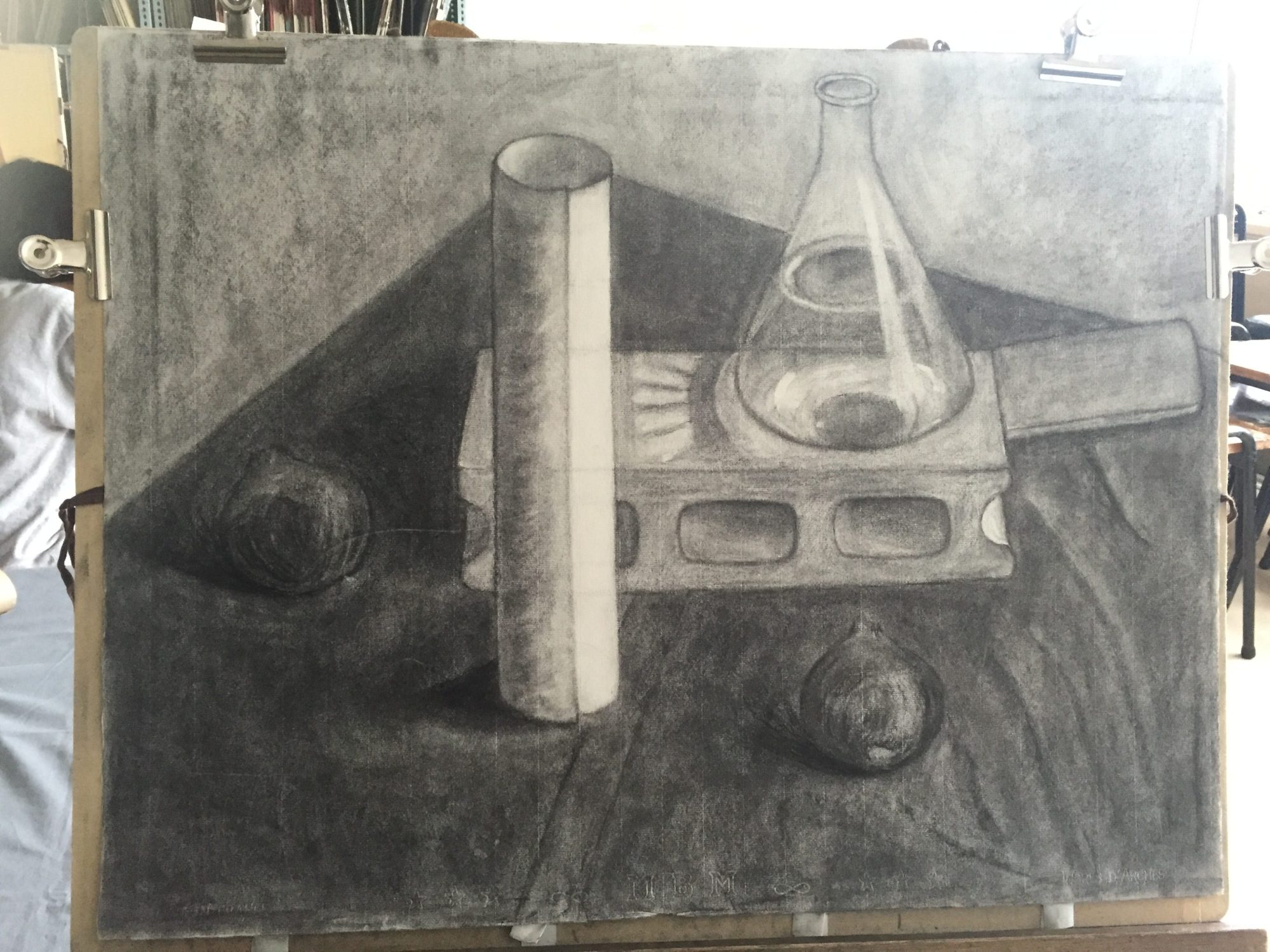 質感の違う対象を一本の木炭で描き分けるのは本当に難しいです。