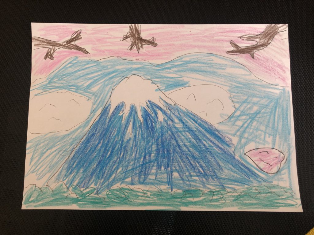 春の絵というテーマを聞いて…どうしても風景の絵が描いてみたくなって滝と桜の山を書きたかったらしいのですが想像通りいかず何枚か失敗しましたが…富士山と桜!ってひらめいたらしく、そこからは鼻歌まじりで楽しく書きました。